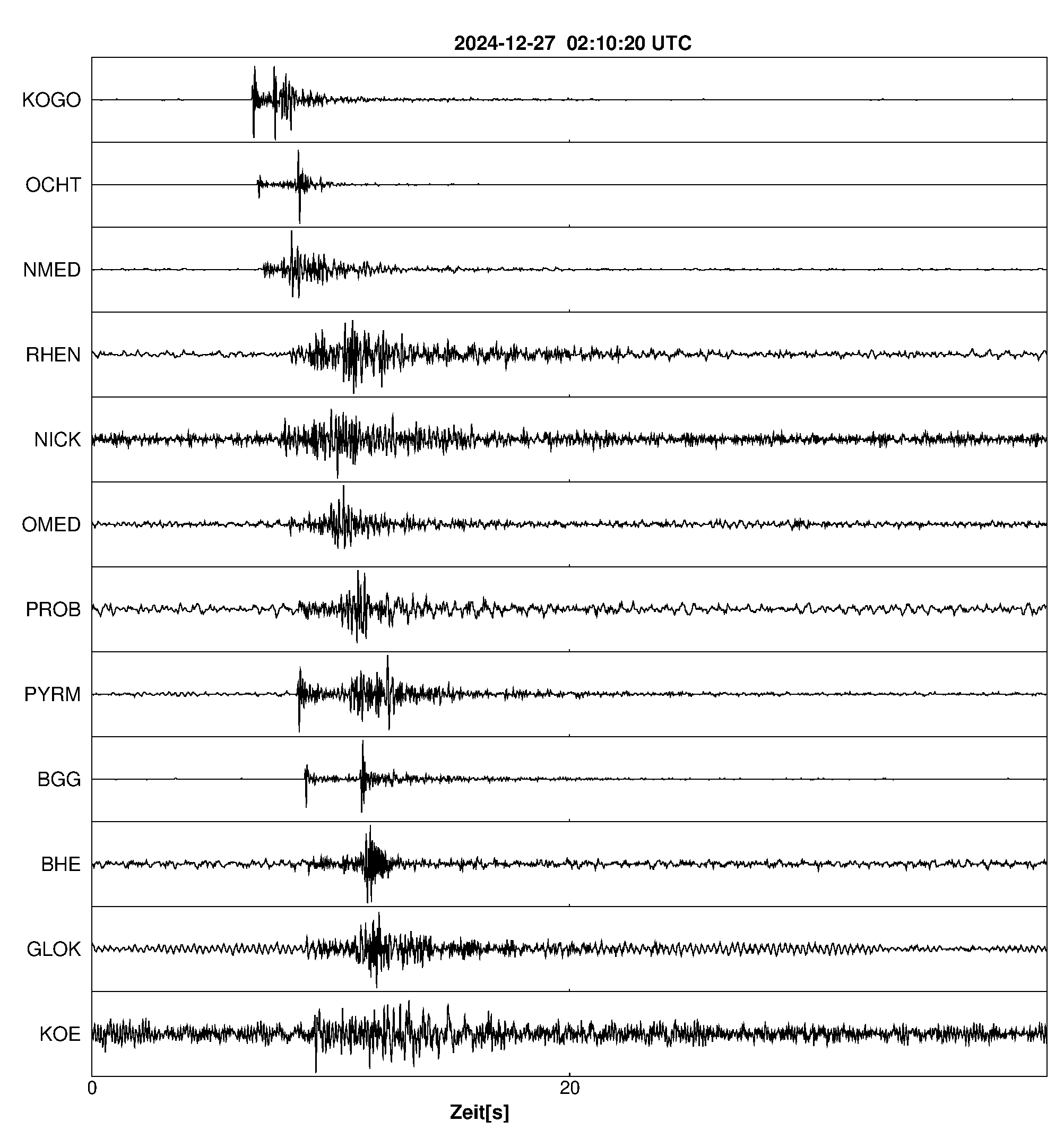 Pfadnavigation Startseite Geologischer Dienst Erdbeben Aktuelle Erdbeben Erdbeben bei Bassenheim, Lkrs. Mayen-Koblenz, RP Teilen Erdbeben bei Bassenheim, Lkrs. Mayen-Koblenz, RP Erdbeben bei: Bassenheim, Lkrs. Mayen-Koblenz, RP Datum/Uhrzeit: am 27.12.2024 um 03:10 Uhr Ortszeit (MEZ) Stärke: 0.8 (Magnitude auf der Richter-Skala) Epizentrum: 50.36° N ㅤ 7.45° E Herdtiefe: ca. 5 km unter der Erdoberfläche Bemerkung: sehr schwaches Erdbeben Seismogramme ausgewählter Erdbebenmessstationen: Erläuterungen: Datum/Uhrzeit:Datum und Zeit des Erdbebens in Ortszeit, also MEZ oder MESZ; Epizentrum:Punkt an der Erdoberfläche über dem Hypozentrum (Lage des Erdbebenherdes in der Tiefe); Magnitude:Erdbebenstärke auf der Richterskala (Lokalmagnitude ML); Herdtiefe:Tiefe des Erdbebens (Hypozentrums) in Kilometern unter NN. Seismogramme:Details zu den Erdbebenmessstationen finden sich im Kartenviewer des LGRB (Baden-Württemberg) und im Kartenviewer des LGB (Rheinland-Pfalz).
