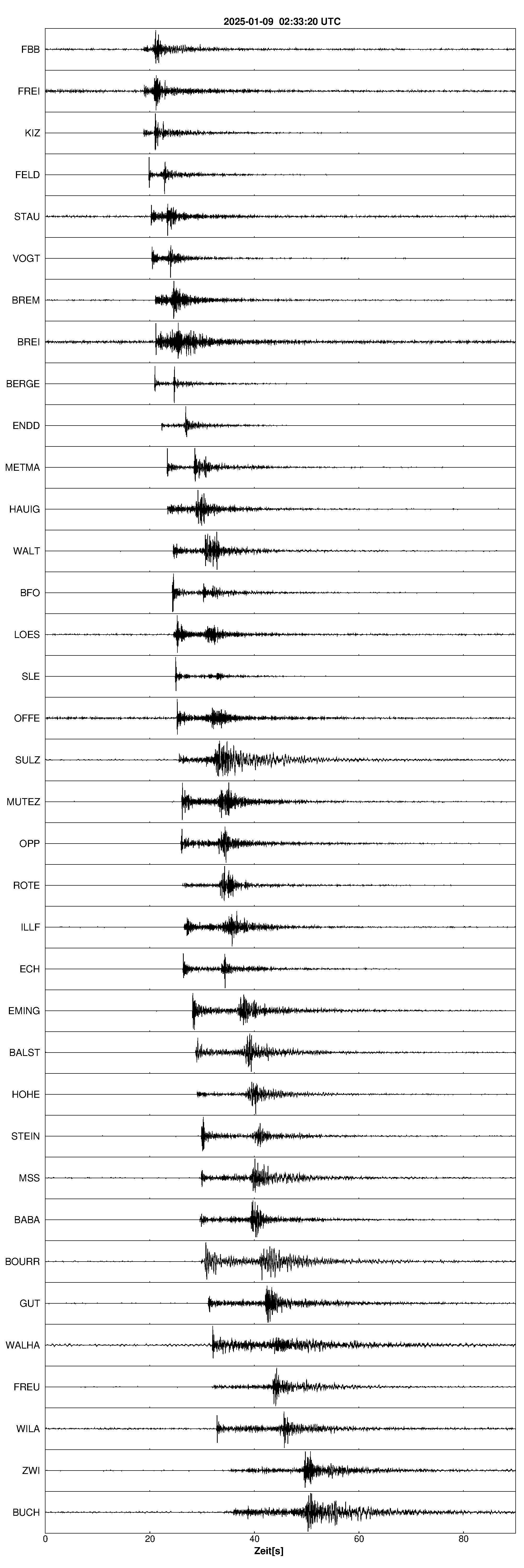 Pfadnavigation Startseite Geologischer Dienst Erdbeben Aktuelle Erdbeben Erdbeben bei Freiburg im Breisgau, BW Teilen Erdbeben bei Freiburg im Breisgau, BW Erdbeben bei: Freiburg im Breisgau, BW Datum/Uhrzeit: am 09.01.2025 um 03:33 Uhr Ortszeit (MEZ) Stärke: 2.4 (Magnitude auf der Richter-Skala) Epizentrum: 48° N ㅤ 7.91° E Herdtiefe: ca. 16 km unter der Erdoberfläche Wahrnehmungen: vereinzelte Wahrnehmungsmeldungen aus Freiburg, St. Peter und Simonswald Bemerkung: schwaches Erdbeben Seismogramme ausgewählter Erdbebenmessstationen: Erläuterungen: Datum/Uhrzeit:Datum und Zeit des Erdbebens in Ortszeit, also MEZ oder MESZ; Epizentrum:Punkt an der Erdoberfläche über dem Hypozentrum (Lage des Erdbebenherdes in der Tiefe); Magnitude:Erdbebenstärke auf der Richterskala (Lokalmagnitude ML); Herdtiefe:Tiefe des Erdbebens (Hypozentrums) in Kilometern unter NN. Seismogramme:Details zu den Erdbebenmessstationen finden sich im Kartenviewer des LGRB (Baden-Württemberg) und im Kartenviewer des LGB (Rheinland-Pfalz).