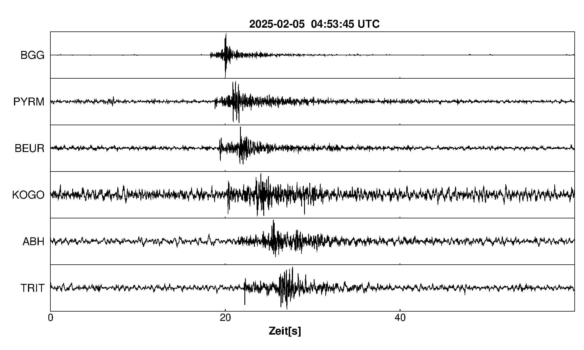 Pfadnavigation Startseite Geologischer Dienst Erdbeben Aktuelle Erdbeben Erdbeben bei Mörsdorf, Rhein-Hunsrück-Kreis, RP Teilen Erdbeben bei Mörsdorf, Rhein-Hunsrück-Kreis, RP Erdbeben bei: Mörsdorf, Rhein-Hunsrück-Kreis, RP Datum/Uhrzeit: am 05.02.2025 um 05:54 Uhr Ortszeit (MEZ) Stärke: 0.7 (Magnitude auf der Richter-Skala) Epizentrum: 50.12° N ㅤ 7.33° E Herdtiefe: ca. 10 km unter der Erdoberfläche Bemerkung: sehr schwaches Erdbeben Seismogramme ausgewählter Erdbebenmessstationen: Erläuterungen: Datum/Uhrzeit:Datum und Zeit des Erdbebens in Ortszeit, also MEZ oder MESZ; Epizentrum:Punkt an der Erdoberfläche über dem Hypozentrum (Lage des Erdbebenherdes in der Tiefe); Magnitude:Erdbebenstärke auf der Richterskala (Lokalmagnitude ML); Herdtiefe:Tiefe des Erdbebens (Hypozentrums) in Kilometern unter NN. Seismogramme:Details zu den Erdbebenmessstationen finden sich im Kartenviewer des LGRB (Baden-Württemberg) und im Kartenviewer des LGB (Rheinland-Pfalz).