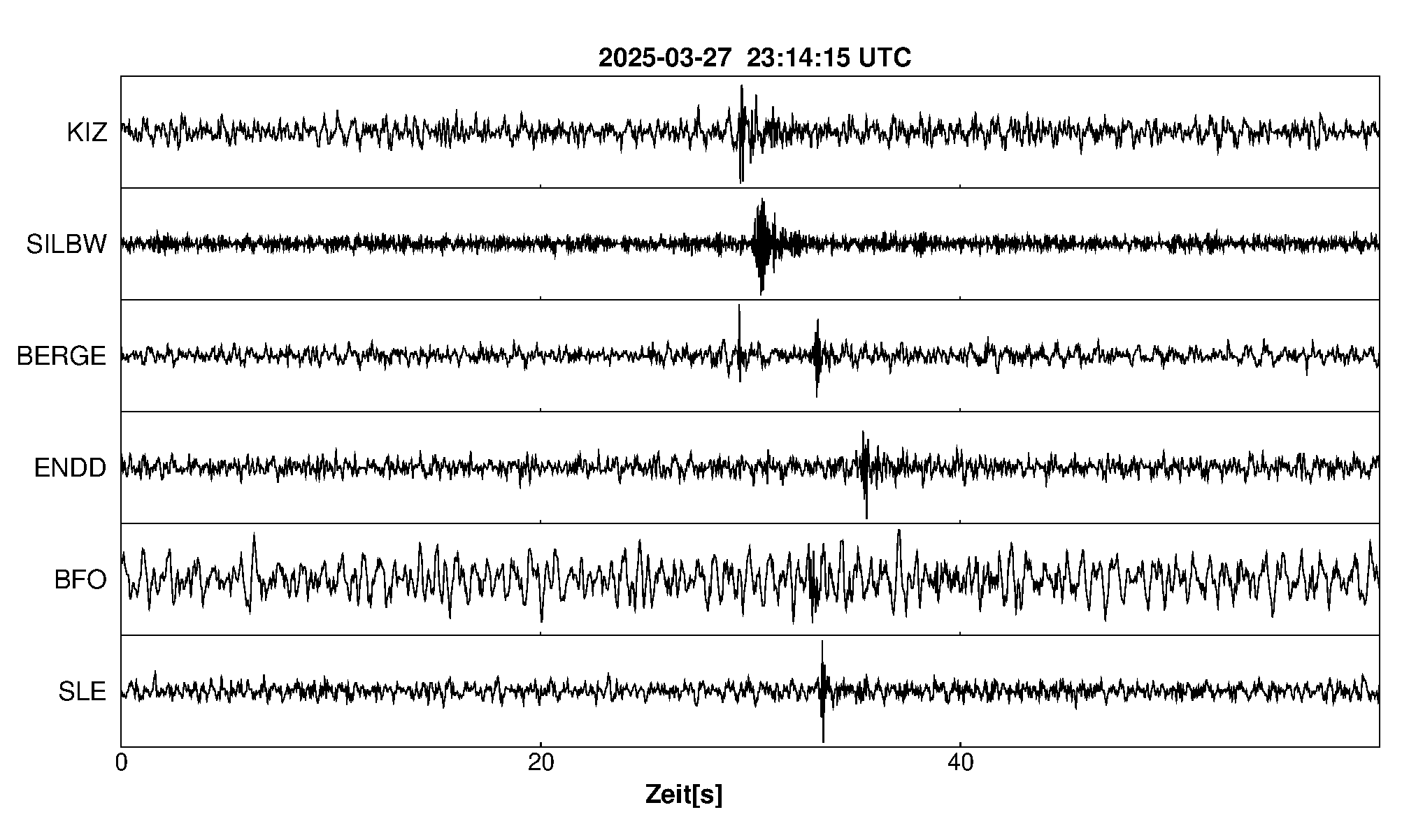 Pfadnavigation Startseite Geologischer Dienst Erdbeben Aktuelle Erdbeben Erdbeben bei Freiburg im Breisgau, BW Teilen Erdbeben bei Freiburg im Breisgau, BW Erdbeben bei: Freiburg im Breisgau, BW Datum/Uhrzeit: am 28.03.2025 um 00:14 Uhr Ortszeit (MEZ) Stärke: 0.3 (Magnitude auf der Richter-Skala) Epizentrum: 48.01° N ㅤ 7.91° E Herdtiefe: ca. 16 km unter der Erdoberfläche Bemerkung: sehr schwaches Erdbeben Seismogramme ausgewählter Erdbebenmessstationen: Erläuterungen: Datum/Uhrzeit:Datum und Zeit des Erdbebens in Ortszeit, also MEZ oder MESZ; Epizentrum:Punkt an der Erdoberfläche über dem Hypozentrum (Lage des Erdbebenherdes in der Tiefe); Magnitude:Erdbebenstärke auf der Richterskala (Lokalmagnitude ML); Herdtiefe:Tiefe des Erdbebens (Hypozentrums) in Kilometern unter NN. Seismogramme:Details zu den Erdbebenmessstationen finden sich im Kartenviewer des LGRB (Baden-Württemberg) und im Kartenviewer des LGB (Rheinland-Pfalz).