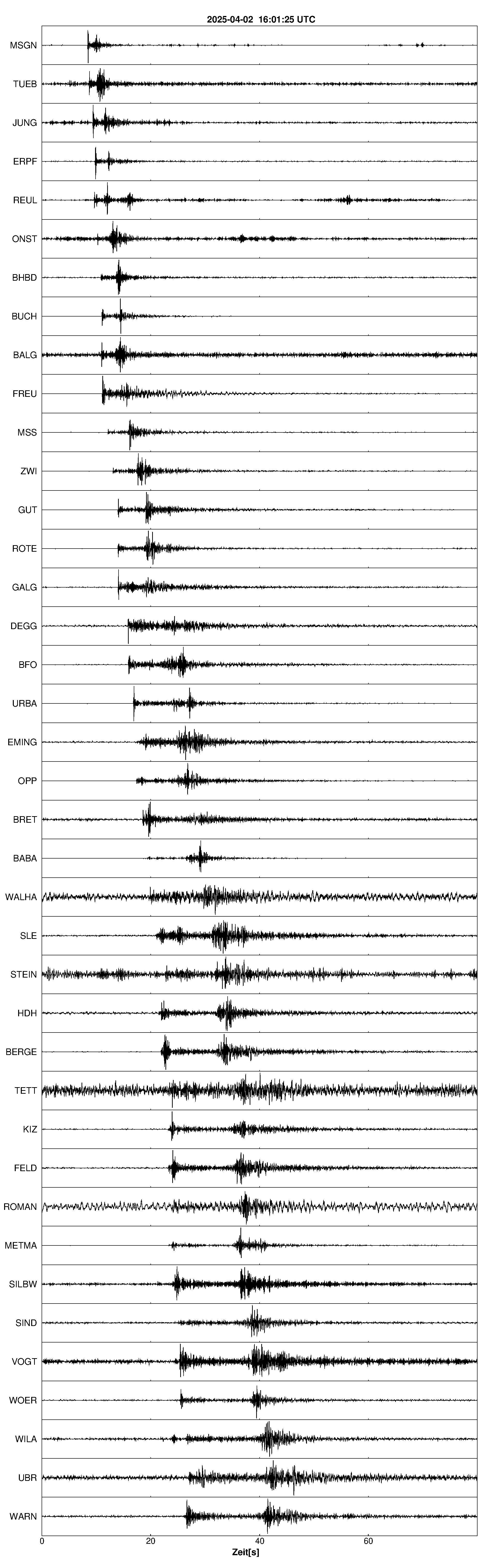 Pfadnavigation Startseite Geologischer Dienst Erdbeben Aktuelle Erdbeben Erdbeben bei Dußlingen, Lkrs. Tübingen, BW Teilen Erdbeben bei Dußlingen, Lkrs. Tübingen, BW Erdbeben bei: Dußlingen, Lkrs. Tübingen, BW Datum/Uhrzeit: am 02.04.2025 um 18:01 Uhr Ortszeit (MESZ) Stärke: 2.2 (Magnitude auf der Richter-Skala) Epizentrum: 48.44° N ㅤ 9.04° E Herdtiefe: ca. 9 km unter der Erdoberfläche Wahrnehmungen: vereinzelt wahrgenommen in Bodelshausen und Umgebung Bemerkung: schwaches Erdbeben Seismogramme ausgewählter Erdbebenmessstationen: Erläuterungen: Datum/Uhrzeit:Datum und Zeit des Erdbebens in Ortszeit, also MEZ oder MESZ; Epizentrum:Punkt an der Erdoberfläche über dem Hypozentrum (Lage des Erdbebenherdes in der Tiefe); Magnitude:Erdbebenstärke auf der Richterskala (Lokalmagnitude ML); Herdtiefe:Tiefe des Erdbebens (Hypozentrums) in Kilometern unter NN. Seismogramme:Details zu den Erdbebenmessstationen finden sich im Kartenviewer des LGRB (Baden-Württemberg) und im Kartenviewer des LGB (Rheinland-Pfalz).