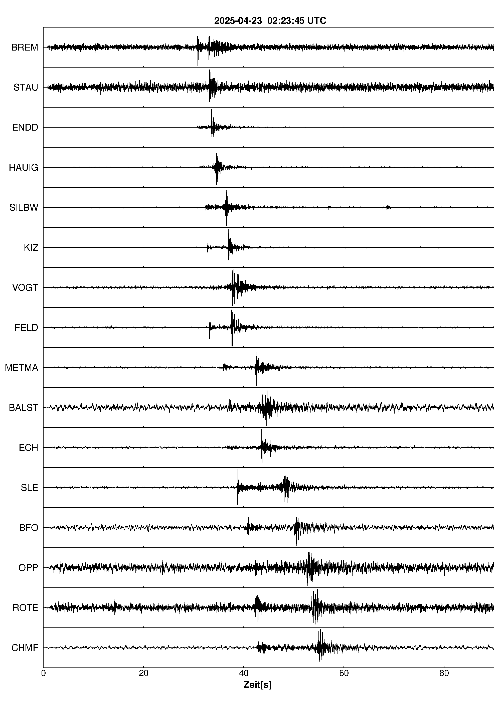 Pfadnavigation Startseite Geologischer Dienst Erdbeben Aktuelle Erdbeben Erdbeben bei Auggen, Lkrs. Breisgau-H., BW Teilen Erdbeben bei Auggen, Lkrs. Breisgau-H., BW Erdbeben bei: Auggen, Lkrs. Breisgau-H., BW Datum/Uhrzeit: am 23.04.2025 um 04:24 Uhr Ortszeit (MESZ) Stärke: 1.2 (Magnitude auf der Richter-Skala) Epizentrum: 47.81° N ㅤ 7.58° E Herdtiefe: ca. 15 km unter der Erdoberfläche Bemerkung: sehr schwaches Erdbeben Seismogramme ausgewählter Erdbebenmessstationen: Erläuterungen: Datum/Uhrzeit:Datum und Zeit des Erdbebens in Ortszeit, also MEZ oder MESZ; Epizentrum:Punkt an der Erdoberfläche über dem Hypozentrum (Lage des Erdbebenherdes in der Tiefe); Magnitude:Erdbebenstärke auf der Richterskala (Lokalmagnitude ML); Herdtiefe:Tiefe des Erdbebens (Hypozentrums) in Kilometern unter NN. Seismogramme:Details zu den Erdbebenmessstationen finden sich im Kartenviewer des LGRB (Baden-Württemberg) und im Kartenviewer des LGB (Rheinland-Pfalz).