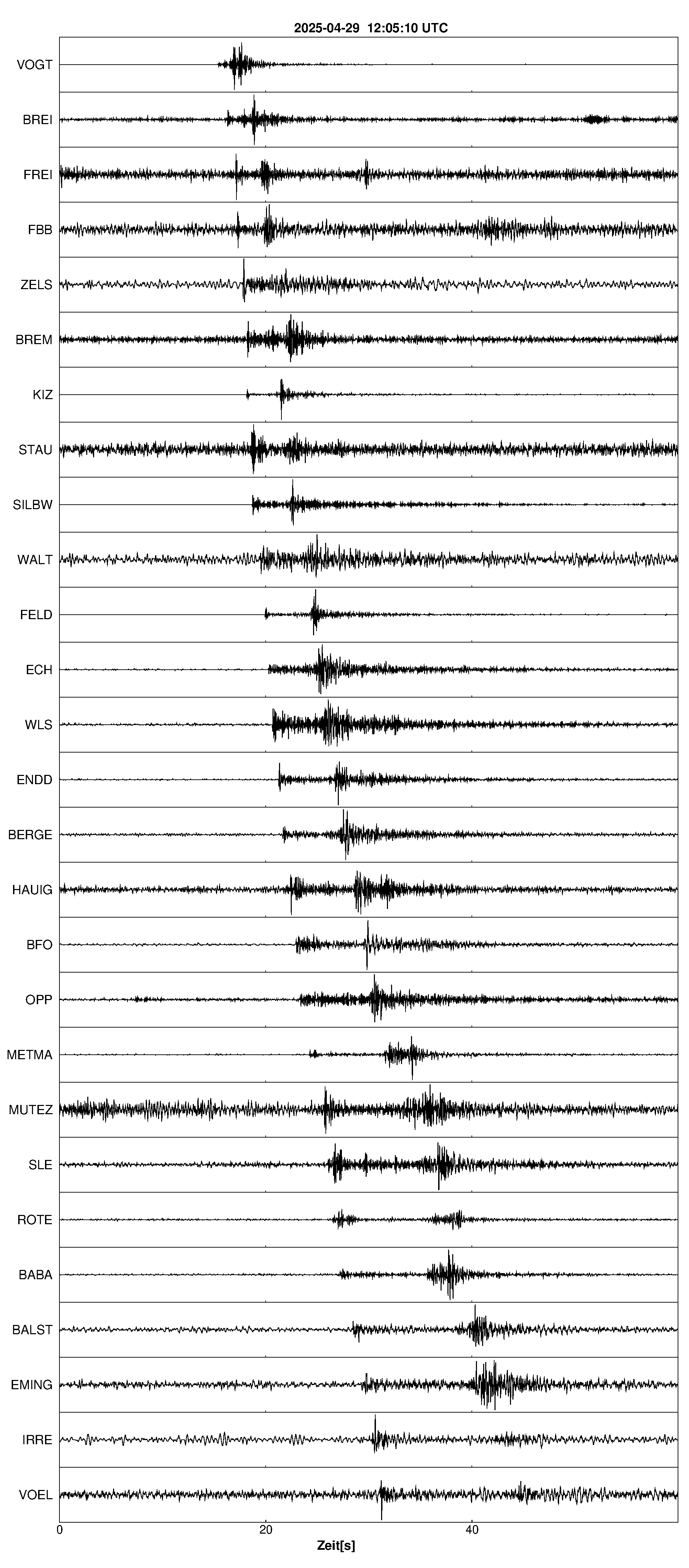 Pfadnavigation Startseite Geologischer Dienst Erdbeben Aktuelle Erdbeben Erdbeben bei Endingen am Kaiserstuhl, Lkrs. Emmendingen, BW Teilen Erdbeben bei Endingen am Kaiserstuhl, Lkrs. Emmendingen, BW Erdbeben bei: Endingen am Kaiserstuhl, Lkrs. Emmendingen, BW Datum/Uhrzeit: am 29.04.2025 um 14:05 Uhr Ortszeit (MESZ) Stärke: 1.7 (Magnitude auf der Richter-Skala) Epizentrum: 48.11° N ㅤ 7.67° E Herdtiefe: ca. 8 km unter der Erdoberfläche Bemerkung: sehr schwaches Erdbeben Seismogramme ausgewählter Erdbebenmessstationen: Erläuterungen: Datum/Uhrzeit:Datum und Zeit des Erdbebens in Ortszeit, also MEZ oder MESZ; Epizentrum:Punkt an der Erdoberfläche über dem Hypozentrum (Lage des Erdbebenherdes in der Tiefe); Magnitude:Erdbebenstärke auf der Richterskala (Lokalmagnitude ML); Herdtiefe:Tiefe des Erdbebens (Hypozentrums) in Kilometern unter NN. Seismogramme:Details zu den Erdbebenmessstationen finden sich im Kartenviewer des LGRB (Baden-Württemberg) und im Kartenviewer des LGB (Rheinland-Pfalz).