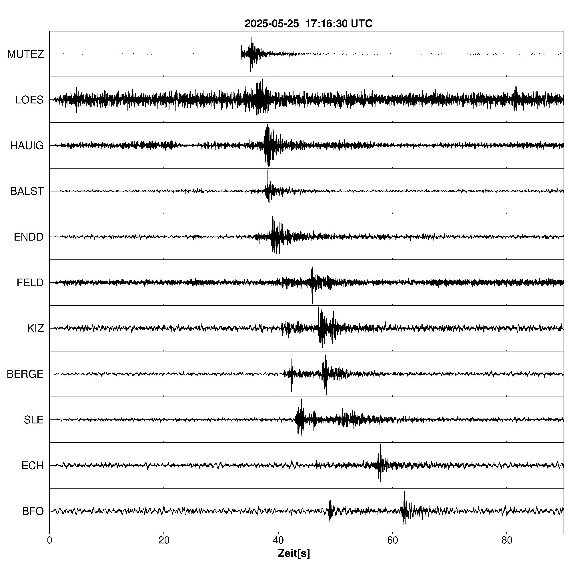 Pfadnavigation Startseite Geologischer Dienst Erdbeben Aktuelle Erdbeben Erdbeben bei Pratteln, Kt. Basel-Landschaft, CH Teilen Erdbeben bei Pratteln, Kt. Basel-Landschaft, CH Erdbeben außerhalb von Baden-Württemberg und Rheinland-Pfalz:Die maßgeblichen Angaben veröffentlicht der lokal zuständige Erdbebendienst. Erdbeben bei: Pratteln, Kt. Basel-Landschaft, CH Datum/Uhrzeit: am 25.05.2025 um 19:17 Uhr Ortszeit (MESZ) Stärke: 1.0 (Magnitude auf der Richter-Skala) Epizentrum: 47.51° N ㅤ 7.68° E Herdtiefe: ca. 13 km unter der Erdoberfläche Bemerkung: sehr schwaches Erdbeben Seismogramme ausgewählter Erdbebenmessstationen: Erläuterungen: Datum/Uhrzeit:Datum und Zeit des Erdbebens in Ortszeit, also MEZ oder MESZ; Epizentrum:Punkt an der Erdoberfläche über dem Hypozentrum (Lage des Erdbebenherdes in der Tiefe); Magnitude:Erdbebenstärke auf der Richterskala (Lokalmagnitude ML); Herdtiefe:Tiefe des Erdbebens (Hypozentrums) in Kilometern unter NN. Seismogramme:Details zu den Erdbebenmessstationen finden sich im Kartenviewer des LGRB (Baden-Württemberg) und im Kartenviewer des LGB (Rheinland-Pfalz).