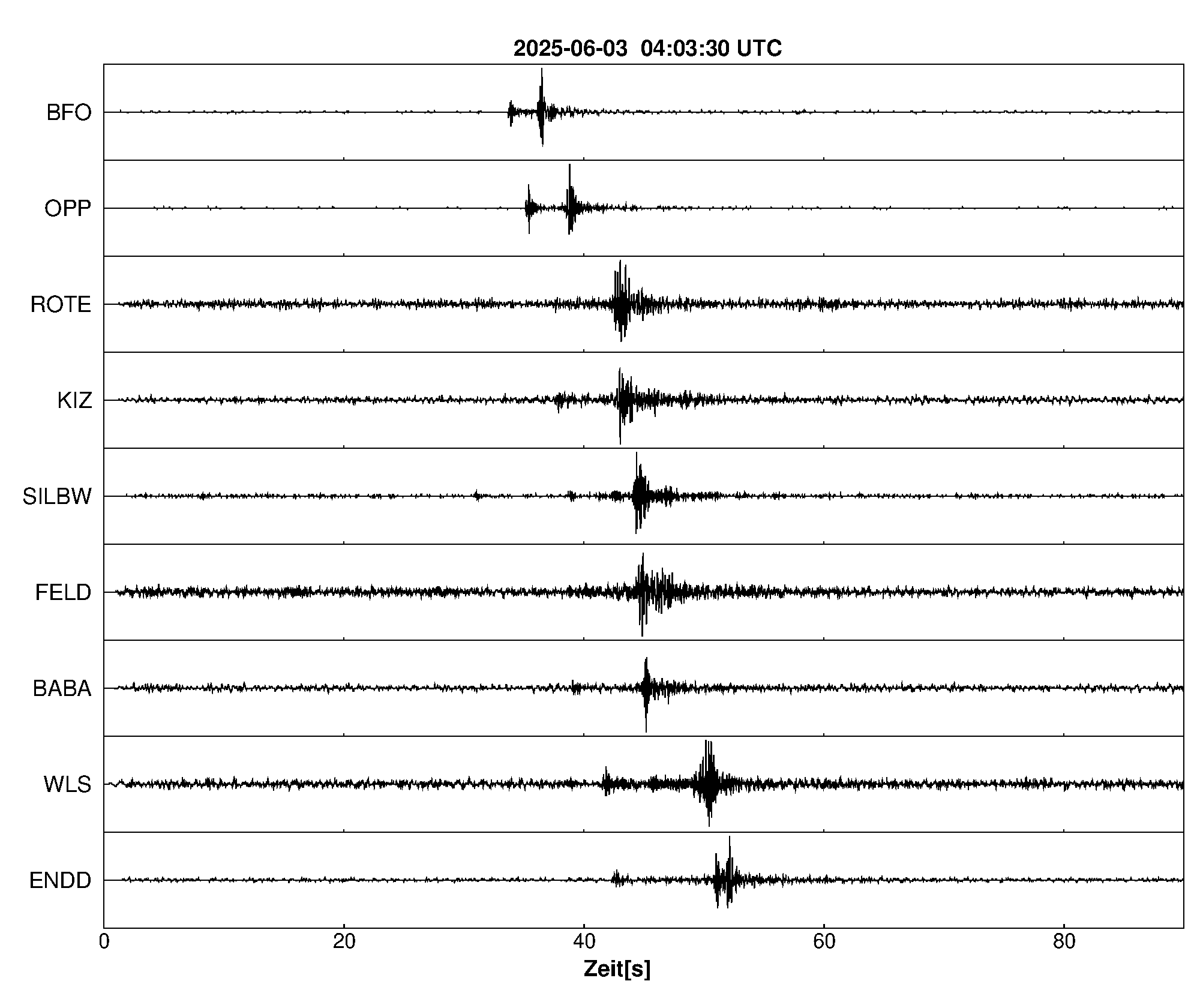 Pfadnavigation Startseite Geologischer Dienst Erdbeben Aktuelle Erdbeben Erdbeben bei Hausach, Ortenaukreis, BW Teilen Erdbeben bei Hausach, Ortenaukreis, BW Erdbeben bei: Hausach, Ortenaukreis, BW Datum/Uhrzeit: am 03.06.2025 um 06:04 Uhr Ortszeit (MESZ) Stärke: 1.2 (Magnitude auf der Richter-Skala) Epizentrum: 48.27° N ㅤ 8.18° E Herdtiefe: ca. 13 km unter der Erdoberfläche Bemerkung: sehr schwaches Erdbeben Seismogramme ausgewählter Erdbebenmessstationen: Erläuterungen: Datum/Uhrzeit:Datum und Zeit des Erdbebens in Ortszeit, also MEZ oder MESZ; Epizentrum:Punkt an der Erdoberfläche über dem Hypozentrum (Lage des Erdbebenherdes in der Tiefe); Magnitude:Erdbebenstärke auf der Richterskala (Lokalmagnitude ML); Herdtiefe:Tiefe des Erdbebens (Hypozentrums) in Kilometern unter NN. Seismogramme:Details zu den Erdbebenmessstationen finden sich im Kartenviewer des LGRB (Baden-Württemberg) und im Kartenviewer des LGB (Rheinland-Pfalz).