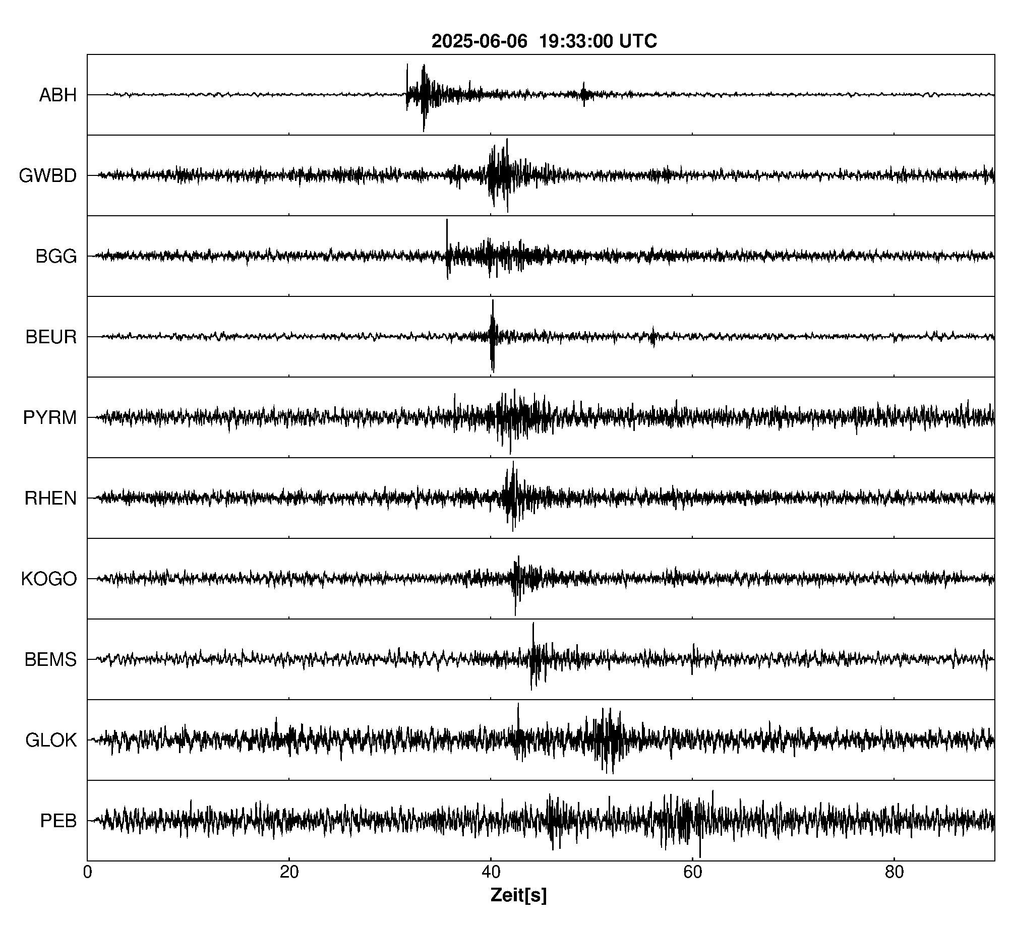 Pfadnavigation Startseite Geologischer Dienst Erdbeben Aktuelle Erdbeben Erdbeben bei Mengerschied, Rhein-Hunsrück-Kreis, RP Teilen Erdbeben bei Mengerschied, Rhein-Hunsrück-Kreis, RP Erdbeben bei: Mengerschied, Rhein-Hunsrück-Kreis, RP Datum/Uhrzeit: am 06.06.2025 um 21:33 Uhr Ortszeit (MESZ) Stärke: 0.7 (Magnitude auf der Richter-Skala) Epizentrum: 49.92° N ㅤ 7.52° E Herdtiefe: ca. 11 km unter der Erdoberfläche Bemerkung: sehr schwaches Erdbeben Seismogramme ausgewählter Erdbebenmessstationen: Erläuterungen: Datum/Uhrzeit:Datum und Zeit des Erdbebens in Ortszeit, also MEZ oder MESZ; Epizentrum:Punkt an der Erdoberfläche über dem Hypozentrum (Lage des Erdbebenherdes in der Tiefe); Magnitude:Erdbebenstärke auf der Richterskala (Lokalmagnitude ML); Herdtiefe:Tiefe des Erdbebens (Hypozentrums) in Kilometern unter NN. Seismogramme:Details zu den Erdbebenmessstationen finden sich im Kartenviewer des LGRB (Baden-Württemberg) und im Kartenviewer des LGB (Rheinland-Pfalz).