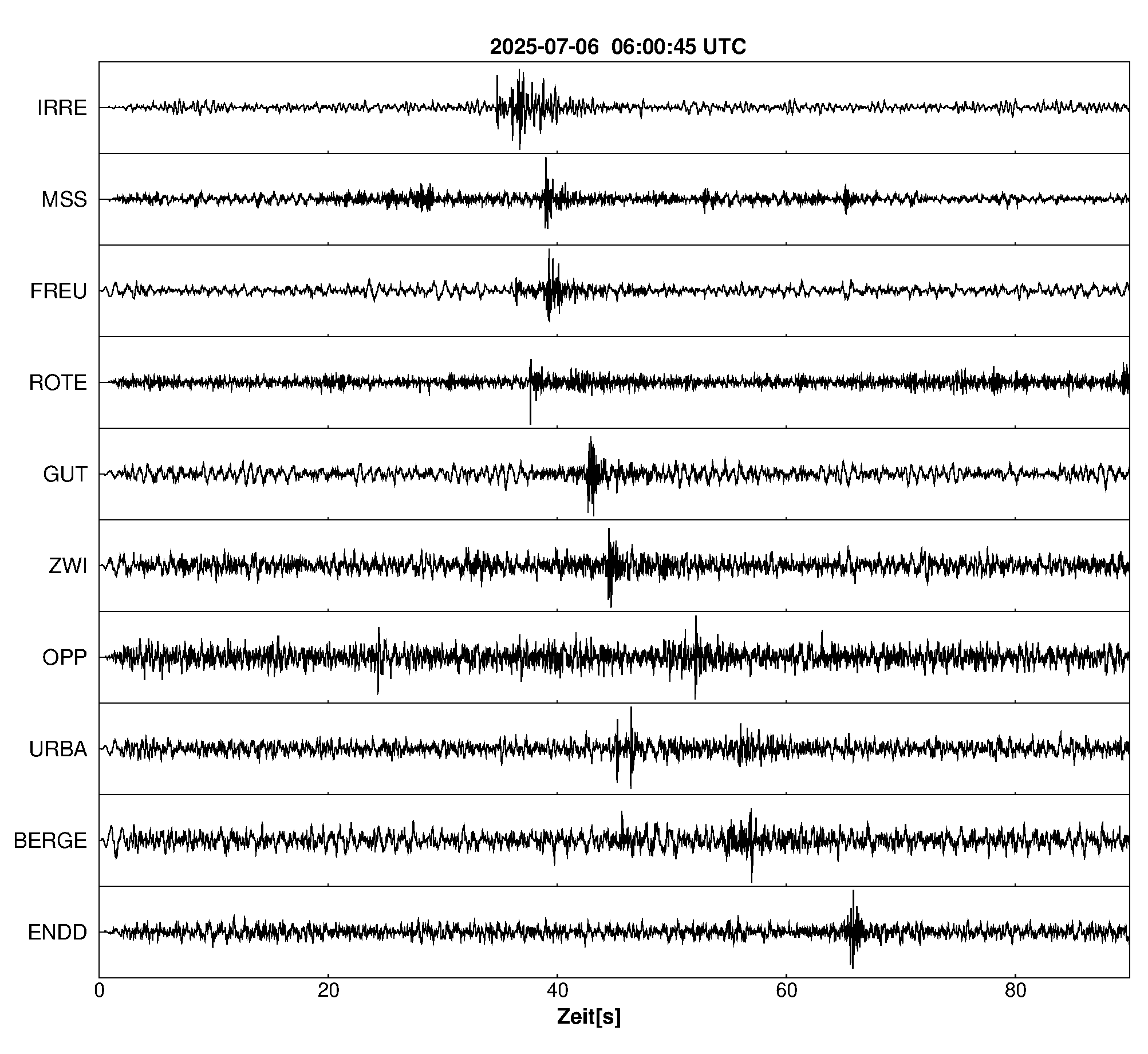 Pfadnavigation Startseite Geologischer Dienst Erdbeben Aktuelle Erdbeben Erdbeben bei Hechingen, Zollernalbkreis, BW Teilen Erdbeben bei Hechingen, Zollernalbkreis, BW Erdbeben bei: Hechingen, Zollernalbkreis, BW Datum/Uhrzeit: am 06.07.2025 um 08:01 Uhr Ortszeit (MESZ) Stärke: 0.5 (Magnitude auf der Richter-Skala) Epizentrum: 48.34° N ㅤ 8.92° E Herdtiefe: ca. 10 km unter der Erdoberfläche Bemerkung: sehr schwaches Erdbeben Seismogramme ausgewählter Erdbebenmessstationen: Erläuterungen: Datum/Uhrzeit:Datum und Zeit des Erdbebens in Ortszeit, also MEZ oder MESZ; Epizentrum:Punkt an der Erdoberfläche über dem Hypozentrum (Lage des Erdbebenherdes in der Tiefe); Magnitude:Erdbebenstärke auf der Richterskala (Lokalmagnitude ML); Herdtiefe:Tiefe des Erdbebens (Hypozentrums) in Kilometern unter NN. Seismogramme:Details zu den Erdbebenmessstationen finden sich im Kartenviewer des LGRB (Baden-Württemberg) und im Kartenviewer des LGB (Rheinland-Pfalz).
