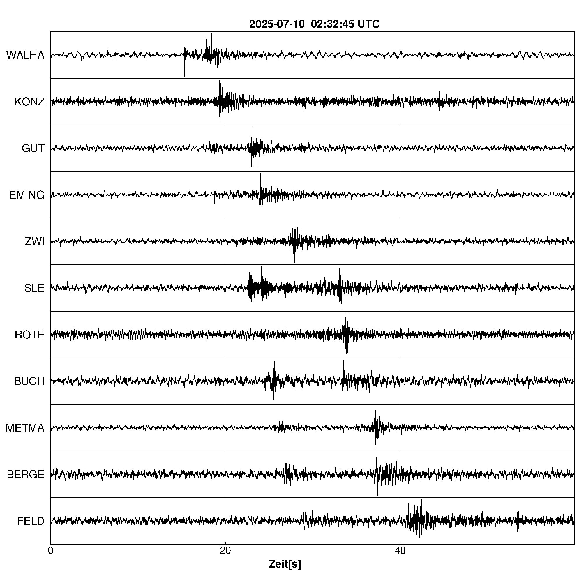 Pfadnavigation Startseite Geologischer Dienst Erdbeben Aktuelle Erdbeben Erdbeben bei Deggenhausertal, Bodenseekreis, BW Teilen Erdbeben bei Deggenhausertal, Bodenseekreis, BW Erdbeben bei: Deggenhausertal, Bodenseekreis, BW Datum/Uhrzeit: am 10.07.2025 um 04:32 Uhr Ortszeit (MESZ) Stärke: 0.8 (Magnitude auf der Richter-Skala) Epizentrum: 47.78° N ㅤ 9.35° E Herdtiefe: ca. 12 km unter der Erdoberfläche Bemerkung: sehr schwaches Erdbeben Seismogramme ausgewählter Erdbebenmessstationen: Erläuterungen: Datum/Uhrzeit:Datum und Zeit des Erdbebens in Ortszeit, also MEZ oder MESZ; Epizentrum:Punkt an der Erdoberfläche über dem Hypozentrum (Lage des Erdbebenherdes in der Tiefe); Magnitude:Erdbebenstärke auf der Richterskala (Lokalmagnitude ML); Herdtiefe:Tiefe des Erdbebens (Hypozentrums) in Kilometern unter NN. Seismogramme:Details zu den Erdbebenmessstationen finden sich im Kartenviewer des LGRB (Baden-Württemberg) und im Kartenviewer des LGB (Rheinland-Pfalz).