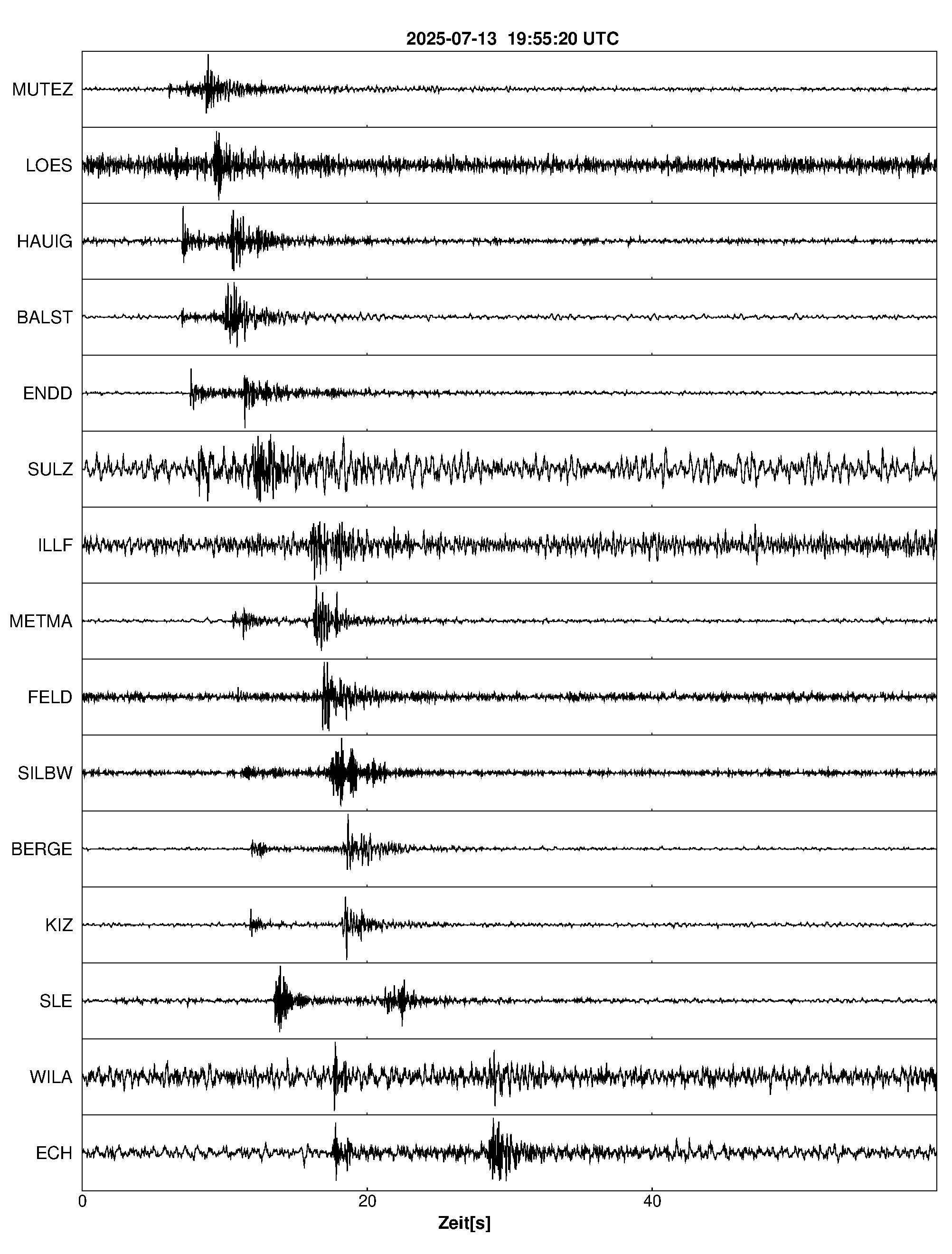 Pfadnavigation Startseite Geologischer Dienst Erdbeben Aktuelle Erdbeben Erdbeben bei Liestal, Kt. Basel-Landschaft, CH Teilen Erdbeben bei Liestal, Kt. Basel-Landschaft, CH Erdbeben außerhalb von Baden-Württemberg und Rheinland-Pfalz:Die maßgeblichen Angaben veröffentlicht der lokal zuständige Erdbebendienst. Erdbeben bei: Liestal, Kt. Basel-Landschaft, CH Datum/Uhrzeit: am 13.07.2025 um 21:55 Uhr Ortszeit (MESZ) Stärke: 0.9 (Magnitude auf der Richter-Skala) Epizentrum: 47.5° N ㅤ 7.75° E Herdtiefe: ca. 19 km unter der Erdoberfläche Bemerkung: sehr schwaches Erdbeben Seismogramme ausgewählter Erdbebenmessstationen: Erläuterungen: Datum/Uhrzeit:Datum und Zeit des Erdbebens in Ortszeit, also MEZ oder MESZ; Epizentrum:Punkt an der Erdoberfläche über dem Hypozentrum (Lage des Erdbebenherdes in der Tiefe); Magnitude:Erdbebenstärke auf der Richterskala (Lokalmagnitude ML); Herdtiefe:Tiefe des Erdbebens (Hypozentrums) in Kilometern unter NN. Seismogramme:Details zu den Erdbebenmessstationen finden sich im Kartenviewer des LGRB (Baden-Württemberg) und im Kartenviewer des LGB (Rheinland-Pfalz).