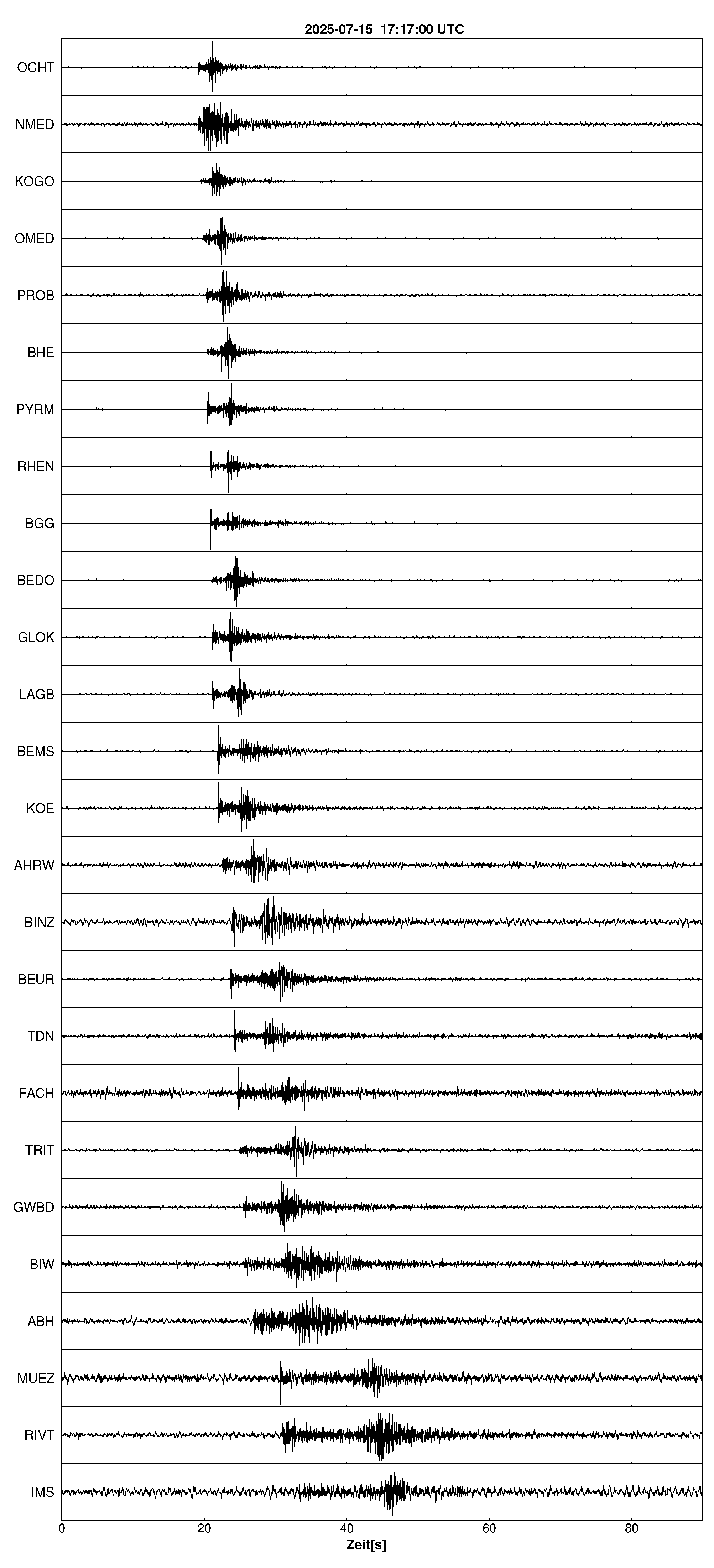 Pfadnavigation Startseite Geologischer Dienst Erdbeben Aktuelle Erdbeben Erdbeben bei Ochtendung, Lkrs. Mayen-Koblenz, RP Teilen Erdbeben bei Ochtendung, Lkrs. Mayen-Koblenz, RP Erdbeben bei: Ochtendung, Lkrs. Mayen-Koblenz, RP Datum/Uhrzeit: am 15.07.2025 um 19:17 Uhr Ortszeit (MESZ) Stärke: 1.4 (Magnitude auf der Richter-Skala) Epizentrum: 50.37° N ㅤ 7.38° E Herdtiefe: ca. 11 km unter der Erdoberfläche Bemerkung: sehr schwaches Erdbeben Seismogramme ausgewählter Erdbebenmessstationen: Erläuterungen: Datum/Uhrzeit:Datum und Zeit des Erdbebens in Ortszeit, also MEZ oder MESZ; Epizentrum:Punkt an der Erdoberfläche über dem Hypozentrum (Lage des Erdbebenherdes in der Tiefe); Magnitude:Erdbebenstärke auf der Richterskala (Lokalmagnitude ML); Herdtiefe:Tiefe des Erdbebens (Hypozentrums) in Kilometern unter NN. Seismogramme:Details zu den Erdbebenmessstationen finden sich im Kartenviewer des LGRB (Baden-Württemberg) und im Kartenviewer des LGB (Rheinland-Pfalz).