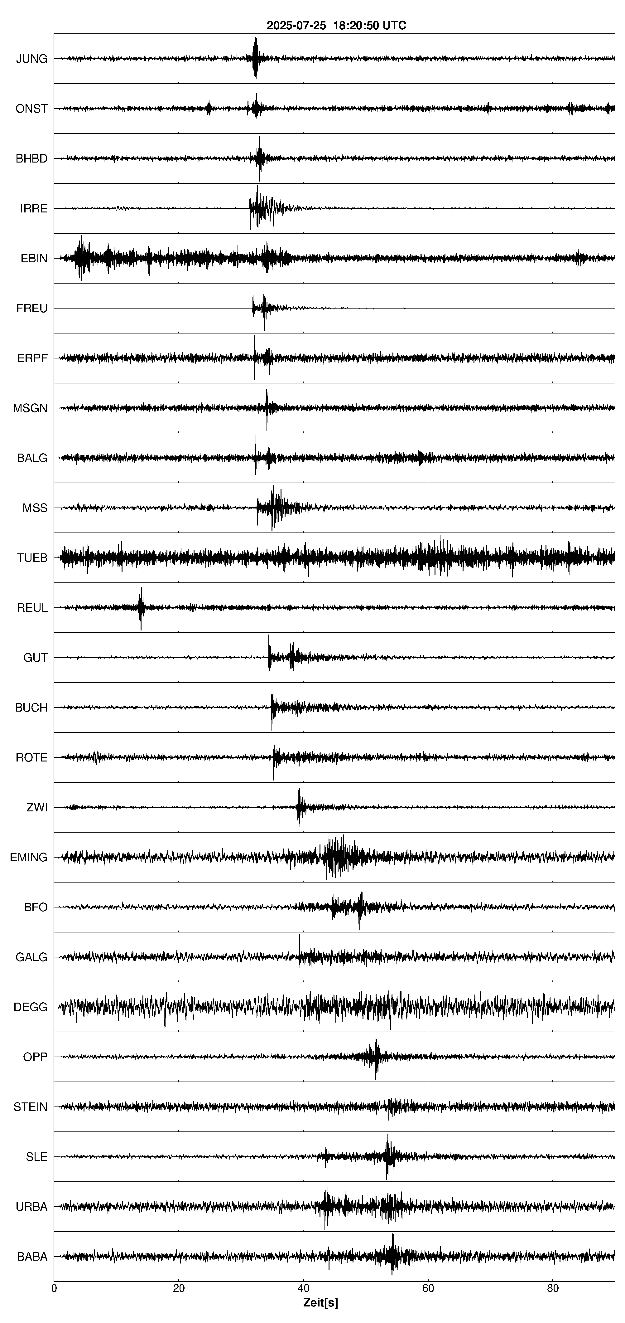 Pfadnavigation Startseite Geologischer Dienst Erdbeben Aktuelle Erdbeben Erdbeben bei Albstadt, Zollernalbkreis, BW Teilen Erdbeben bei Albstadt, Zollernalbkreis, BW Erdbeben bei: Albstadt, Zollernalbkreis, BW Datum/Uhrzeit: am 25.07.2025 um 20:21 Uhr Ortszeit (MESZ) Stärke: 1.1 (Magnitude auf der Richter-Skala) Epizentrum: 48.3° N ㅤ 9.03° E Herdtiefe: ca. 7 km unter der Erdoberfläche Bemerkung: sehr schwaches Erdbeben Seismogramme ausgewählter Erdbebenmessstationen: Erläuterungen: Datum/Uhrzeit:Datum und Zeit des Erdbebens in Ortszeit, also MEZ oder MESZ; Epizentrum:Punkt an der Erdoberfläche über dem Hypozentrum (Lage des Erdbebenherdes in der Tiefe); Magnitude:Erdbebenstärke auf der Richterskala (Lokalmagnitude ML); Herdtiefe:Tiefe des Erdbebens (Hypozentrums) in Kilometern unter NN. Seismogramme:Details zu den Erdbebenmessstationen finden sich im Kartenviewer des LGRB (Baden-Württemberg) und im Kartenviewer des LGB (Rheinland-Pfalz).