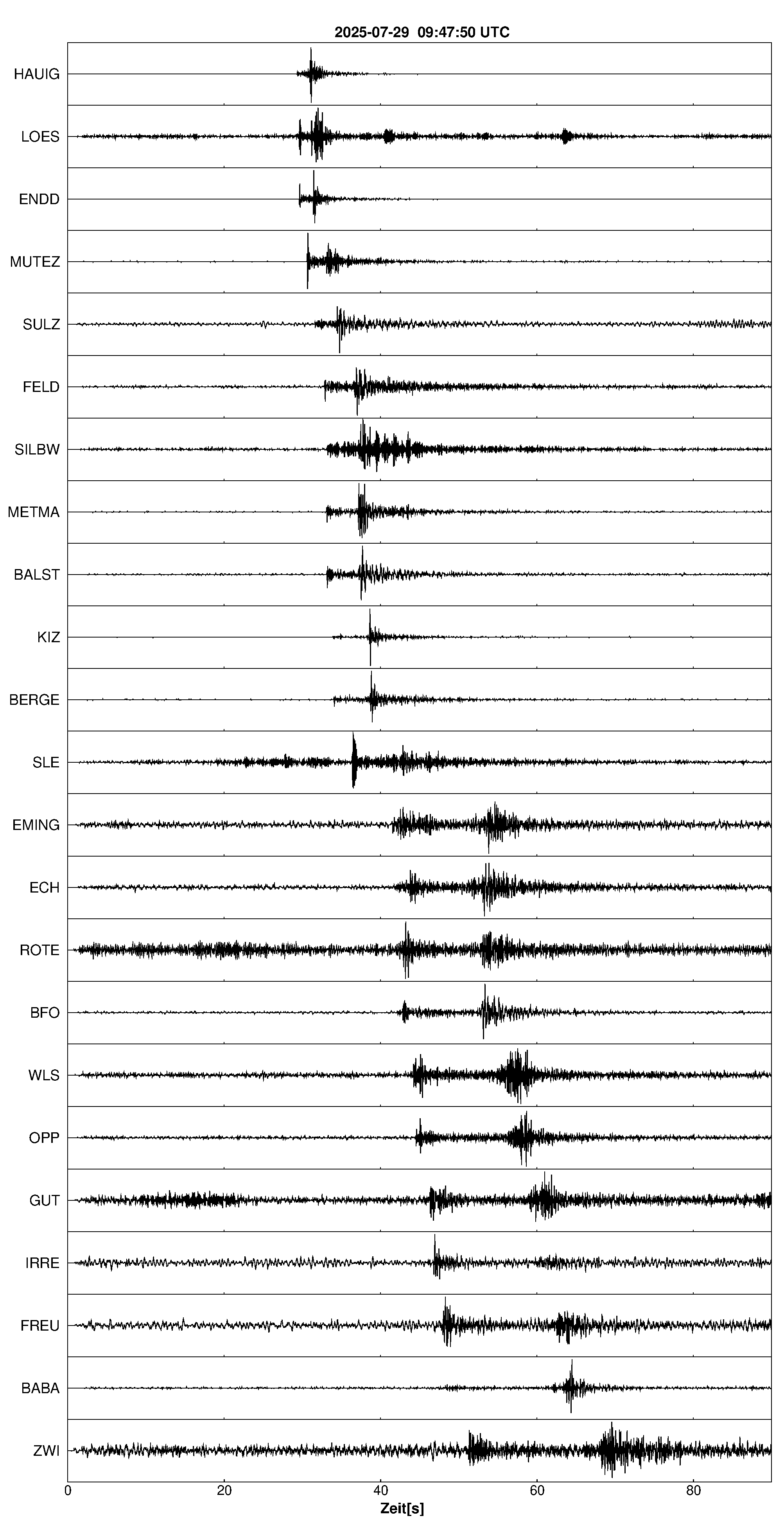 Pfadnavigation Startseite Geologischer Dienst Erdbeben Aktuelle Erdbeben Erdbeben bei Rheinfelden (Baden), Lkrs. Lörrach, BW Teilen Erdbeben bei Rheinfelden (Baden), Lkrs. Lörrach, BW Erdbeben bei: Rheinfelden (Baden), Lkrs. Lörrach, BW Datum/Uhrzeit: am 29.07.2025 um 11:48 Uhr Ortszeit (MESZ) Stärke: 1.6 (Magnitude auf der Richter-Skala) Epizentrum: 47.62° N ㅤ 7.83° E Herdtiefe: ca. 5 km unter der Erdoberfläche Bemerkung: sehr schwaches Erdbeben Seismogramme ausgewählter Erdbebenmessstationen: Erläuterungen: Datum/Uhrzeit:Datum und Zeit des Erdbebens in Ortszeit, also MEZ oder MESZ; Epizentrum:Punkt an der Erdoberfläche über dem Hypozentrum (Lage des Erdbebenherdes in der Tiefe); Magnitude:Erdbebenstärke auf der Richterskala (Lokalmagnitude ML); Herdtiefe:Tiefe des Erdbebens (Hypozentrums) in Kilometern unter NN. Seismogramme:Details zu den Erdbebenmessstationen finden sich im Kartenviewer des LGRB (Baden-Württemberg) und im Kartenviewer des LGB (Rheinland-Pfalz).