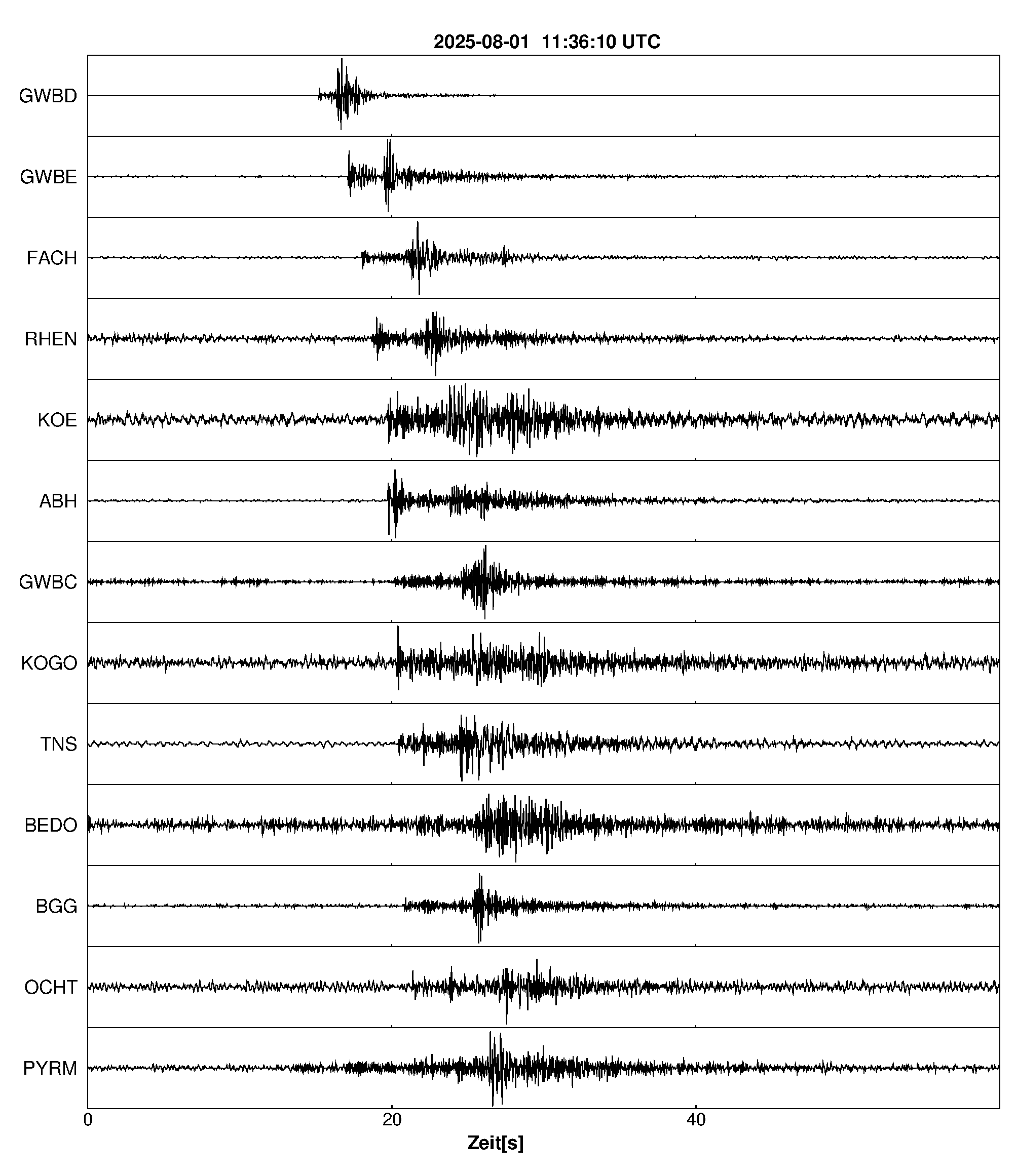 Pfadnavigation Startseite Geologischer Dienst Erdbeben Aktuelle Erdbeben Erdbeben bei Welterod, Rhein-Lahn-Kreis, RP Teilen Erdbeben bei Welterod, Rhein-Lahn-Kreis, RP Erdbeben bei: Welterod, Rhein-Lahn-Kreis, RP Datum/Uhrzeit: am 01.08.2025 um 13:36 Uhr Ortszeit (MESZ) Stärke: 1.2 (Magnitude auf der Richter-Skala) Epizentrum: 50.13° N ㅤ 7.91° E Herdtiefe: ca. 9 km unter der Erdoberfläche Bemerkung: sehr schwaches Erdbeben Seismogramme ausgewählter Erdbebenmessstationen: Erläuterungen: Datum/Uhrzeit:Datum und Zeit des Erdbebens in Ortszeit, also MEZ oder MESZ; Epizentrum:Punkt an der Erdoberfläche über dem Hypozentrum (Lage des Erdbebenherdes in der Tiefe); Magnitude:Erdbebenstärke auf der Richterskala (Lokalmagnitude ML); Herdtiefe:Tiefe des Erdbebens (Hypozentrums) in Kilometern unter NN. Seismogramme:Details zu den Erdbebenmessstationen finden sich im Kartenviewer des LGRB (Baden-Württemberg) und im Kartenviewer des LGB (Rheinland-Pfalz).