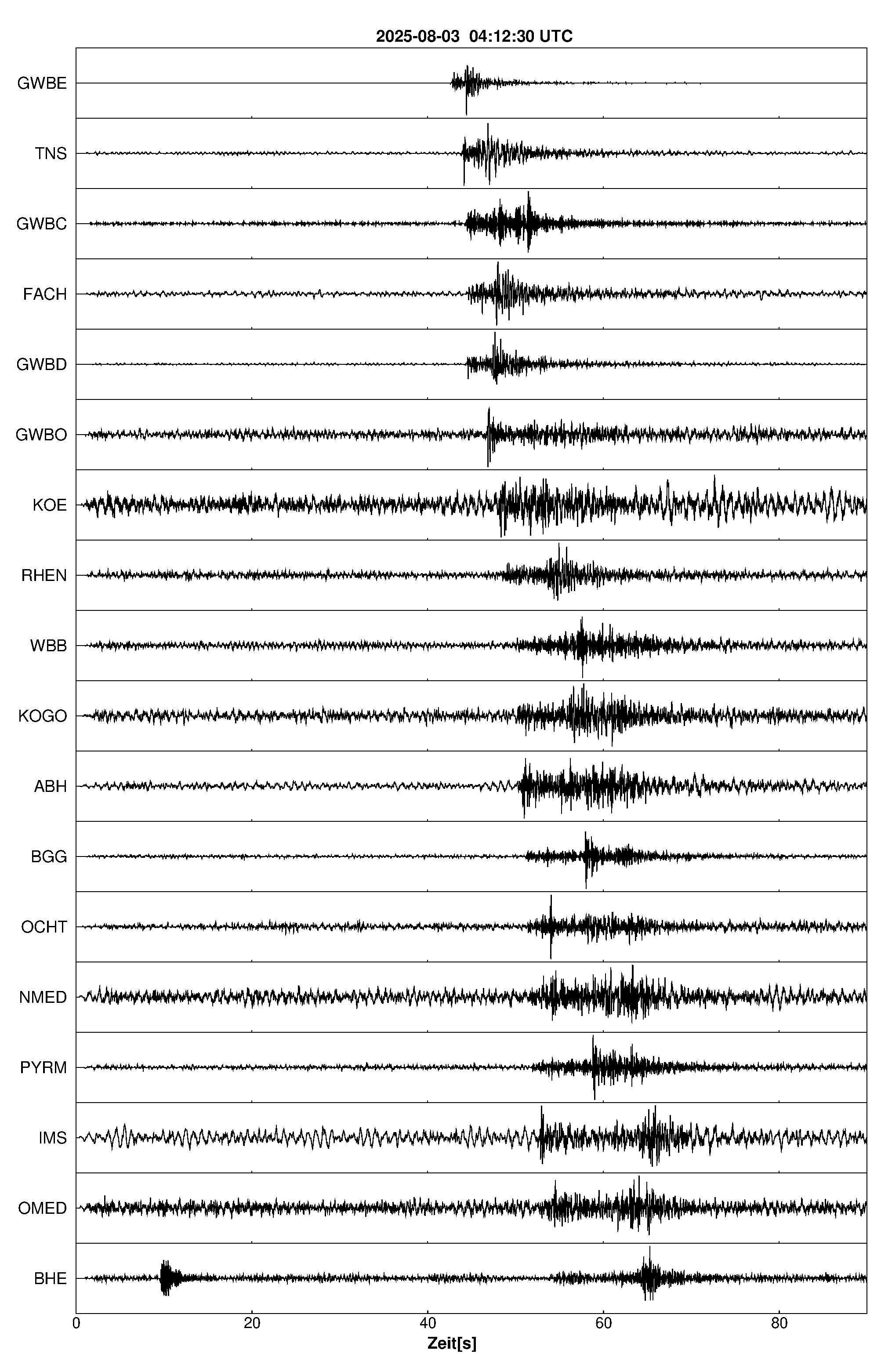 Pfadnavigation Startseite Geologischer Dienst Erdbeben Aktuelle Erdbeben Erdbeben bei Hünstetten, Rheingau-Taunus-Kreis, HS Teilen Erdbeben bei Hünstetten, Rheingau-Taunus-Kreis, HS Erdbeben außerhalb von Baden-Württemberg und Rheinland-Pfalz:Die maßgeblichen Angaben veröffentlicht der lokal zuständige Erdbebendienst. Erdbeben bei: Hünstetten, Rheingau-Taunus-Kreis, HS Datum/Uhrzeit: am 03.08.2025 um 06:13 Uhr Ortszeit (MESZ) Stärke: 0.9 (Magnitude auf der Richter-Skala) Epizentrum: 50.2° N ㅤ 8.2° E Herdtiefe: ca. 3 km unter der Erdoberfläche Bemerkung: sehr schwaches Erdbeben Seismogramme ausgewählter Erdbebenmessstationen: Erläuterungen: Datum/Uhrzeit:Datum und Zeit des Erdbebens in Ortszeit, also MEZ oder MESZ; Epizentrum:Punkt an der Erdoberfläche über dem Hypozentrum (Lage des Erdbebenherdes in der Tiefe); Magnitude:Erdbebenstärke auf der Richterskala (Lokalmagnitude ML); Herdtiefe:Tiefe des Erdbebens (Hypozentrums) in Kilometern unter NN. Seismogramme:Details zu den Erdbebenmessstationen finden sich im Kartenviewer des LGRB (Baden-Württemberg) und im Kartenviewer des LGB (Rheinland-Pfalz).