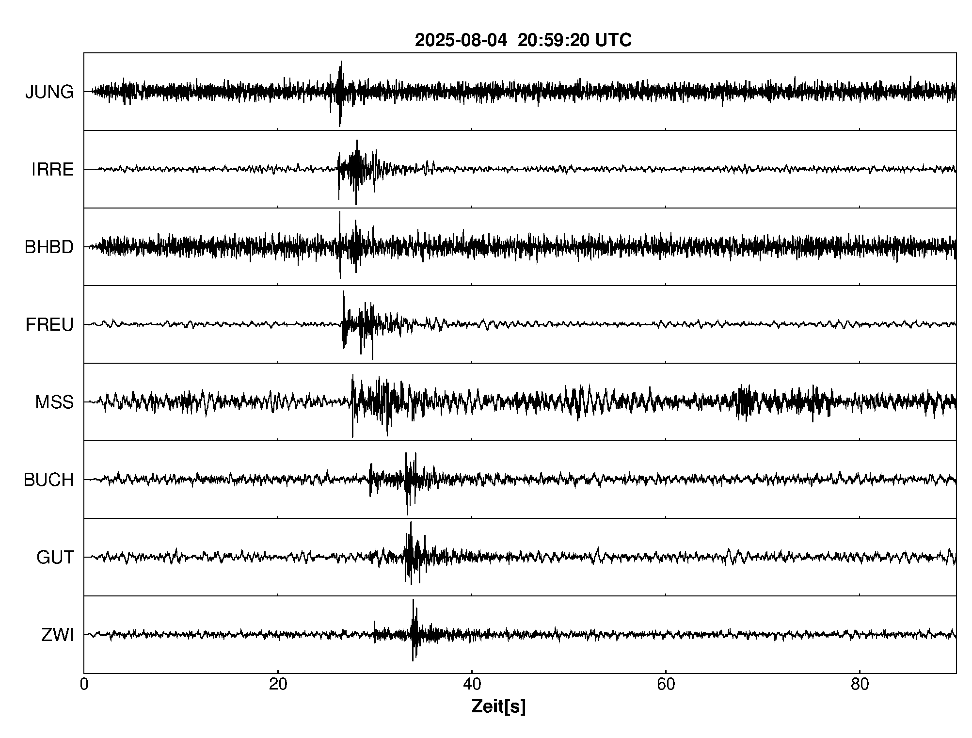 Pfadnavigation Startseite Geologischer Dienst Erdbeben Aktuelle Erdbeben Erdbeben bei Jungingen, Zollernalbkreis, BW Teilen Erdbeben bei Jungingen, Zollernalbkreis, BW Erdbeben bei: Jungingen, Zollernalbkreis, BW Datum/Uhrzeit: am 04.08.2025 um 22:59 Uhr Ortszeit (MESZ) Stärke: 0.7 (Magnitude auf der Richter-Skala) Epizentrum: 48.32° N ㅤ 9.04° E Herdtiefe: ca. 5 km unter der Erdoberfläche Bemerkung: sehr schwaches Erdbeben Seismogramme ausgewählter Erdbebenmessstationen: Erläuterungen: Datum/Uhrzeit:Datum und Zeit des Erdbebens in Ortszeit, also MEZ oder MESZ; Epizentrum:Punkt an der Erdoberfläche über dem Hypozentrum (Lage des Erdbebenherdes in der Tiefe); Magnitude:Erdbebenstärke auf der Richterskala (Lokalmagnitude ML); Herdtiefe:Tiefe des Erdbebens (Hypozentrums) in Kilometern unter NN. Seismogramme:Details zu den Erdbebenmessstationen finden sich im Kartenviewer des LGRB (Baden-Württemberg) und im Kartenviewer des LGB (Rheinland-Pfalz).