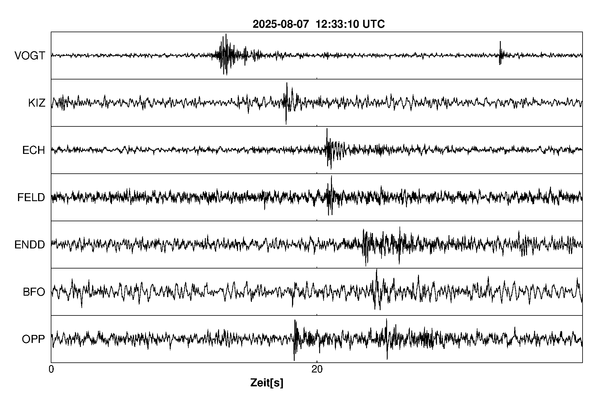 Pfadnavigation Startseite Geologischer Dienst Erdbeben Aktuelle Erdbeben Erdbeben bei Endingen am Kaiserstuhl, Lkrs. Emmendingen, BW Teilen Erdbeben bei Endingen am Kaiserstuhl, Lkrs. Emmendingen, BW Erdbeben bei: Endingen am Kaiserstuhl, Lkrs. Emmendingen, BW Datum/Uhrzeit: am 07.08.2025 um 14:33 Uhr Ortszeit (MESZ) Stärke: 0.6 (Magnitude auf der Richter-Skala) Epizentrum: 48.14° N ㅤ 7.66° E Herdtiefe: ca. 10 km unter der Erdoberfläche Bemerkung: sehr schwaches Erdbeben Seismogramme ausgewählter Erdbebenmessstationen: Erläuterungen: Datum/Uhrzeit:Datum und Zeit des Erdbebens in Ortszeit, also MEZ oder MESZ; Epizentrum:Punkt an der Erdoberfläche über dem Hypozentrum (Lage des Erdbebenherdes in der Tiefe); Magnitude:Erdbebenstärke auf der Richterskala (Lokalmagnitude ML); Herdtiefe:Tiefe des Erdbebens (Hypozentrums) in Kilometern unter NN. Seismogramme:Details zu den Erdbebenmessstationen finden sich im Kartenviewer des LGRB (Baden-Württemberg) und im Kartenviewer des LGB (Rheinland-Pfalz).