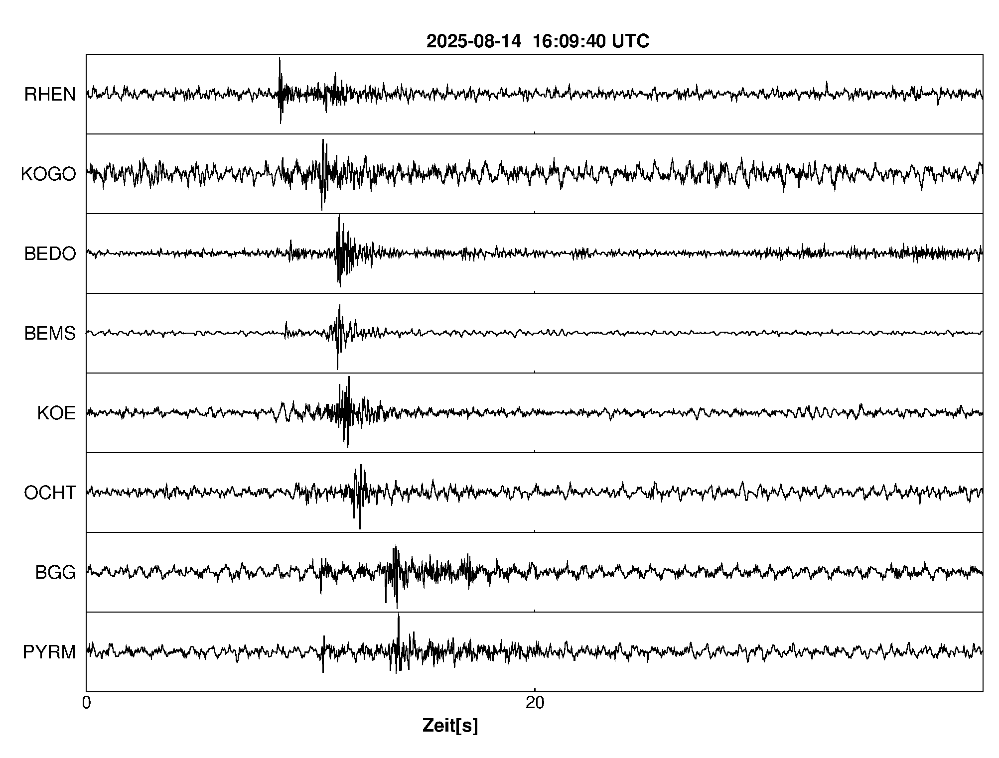 Pfadnavigation Startseite Geologischer Dienst Erdbeben Aktuelle Erdbeben Erdbeben bei Koblenz, RP Teilen Erdbeben bei Koblenz, RP Erdbeben bei: Koblenz, RP Datum/Uhrzeit: am 14.08.2025 um 18:09 Uhr Ortszeit (MESZ) Stärke: 0.4 (Magnitude auf der Richter-Skala) Epizentrum: 50.36° N ㅤ 7.58° E Herdtiefe: ca. 14 km unter der Erdoberfläche Bemerkung: sehr schwaches Erdbeben Seismogramme ausgewählter Erdbebenmessstationen: Erläuterungen: Datum/Uhrzeit:Datum und Zeit des Erdbebens in Ortszeit, also MEZ oder MESZ; Epizentrum:Punkt an der Erdoberfläche über dem Hypozentrum (Lage des Erdbebenherdes in der Tiefe); Magnitude:Erdbebenstärke auf der Richterskala (Lokalmagnitude ML); Herdtiefe:Tiefe des Erdbebens (Hypozentrums) in Kilometern unter NN. Seismogramme:Details zu den Erdbebenmessstationen finden sich im Kartenviewer des LGRB (Baden-Württemberg) und im Kartenviewer des LGB (Rheinland-Pfalz).