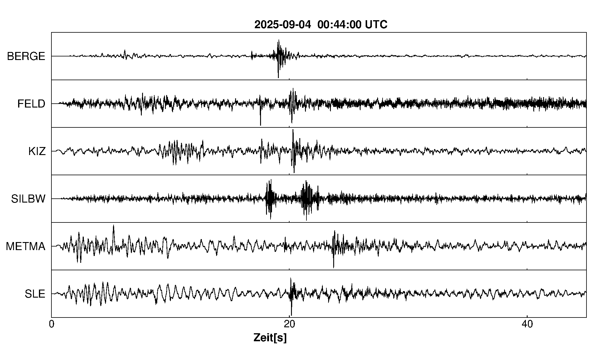 Pfadnavigation Startseite Geologischer Dienst Erdbeben Aktuelle Erdbeben Erdbeben bei Furtwangen im Schwarzwald, Schwarzw.-Baar-Kr., BW Teilen Erdbeben bei Furtwangen im Schwarzwald, Schwarzw.-Baar-Kr., BW Erdbeben bei: Furtwangen im Schwarzwald, Schwarzw.-Baar-Kr., BW Datum/Uhrzeit: am 04.09.2025 um 02:44 Uhr Ortszeit (MESZ) Stärke: 0.6 (Magnitude auf der Richter-Skala) Epizentrum: 48.01° N ㅤ 8.18° E Herdtiefe: ca. 5 km unter der Erdoberfläche Bemerkung: sehr schwaches Erdbeben Seismogramme ausgewählter Erdbebenmessstationen: Erläuterungen: Datum/Uhrzeit:Datum und Zeit des Erdbebens in Ortszeit, also MEZ oder MESZ; Epizentrum:Punkt an der Erdoberfläche über dem Hypozentrum (Lage des Erdbebenherdes in der Tiefe); Magnitude:Erdbebenstärke auf der Richterskala (Lokalmagnitude ML); Herdtiefe:Tiefe des Erdbebens (Hypozentrums) in Kilometern unter NN. Seismogramme:Details zu den Erdbebenmessstationen finden sich im Kartenviewer des LGRB (Baden-Württemberg) und im Kartenviewer des LGB (Rheinland-Pfalz).
