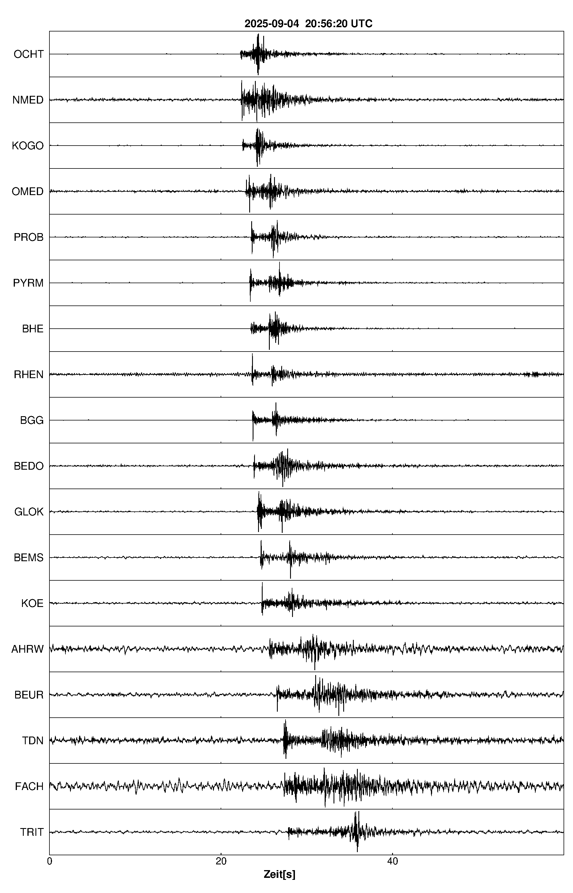 Pfadnavigation Startseite Geologischer Dienst Erdbeben Aktuelle Erdbeben Erdbeben bei Ochtendung, Lkrs. Mayen-Koblenz, RP Teilen Erdbeben bei Ochtendung, Lkrs. Mayen-Koblenz, RP Erdbeben bei: Ochtendung, Lkrs. Mayen-Koblenz, RP Datum/Uhrzeit: am 04.09.2025 um 22:56 Uhr Ortszeit (MESZ) Stärke: 1.0 (Magnitude auf der Richter-Skala) Epizentrum: 50.35° N ㅤ 7.39° E Herdtiefe: ca. 13 km unter der Erdoberfläche Bemerkung: sehr schwaches Erdbeben Seismogramme ausgewählter Erdbebenmessstationen: Erläuterungen: Datum/Uhrzeit:Datum und Zeit des Erdbebens in Ortszeit, also MEZ oder MESZ; Epizentrum:Punkt an der Erdoberfläche über dem Hypozentrum (Lage des Erdbebenherdes in der Tiefe); Magnitude:Erdbebenstärke auf der Richterskala (Lokalmagnitude ML); Herdtiefe:Tiefe des Erdbebens (Hypozentrums) in Kilometern unter NN. Seismogramme:Details zu den Erdbebenmessstationen finden sich im Kartenviewer des LGRB (Baden-Württemberg) und im Kartenviewer des LGB (Rheinland-Pfalz).