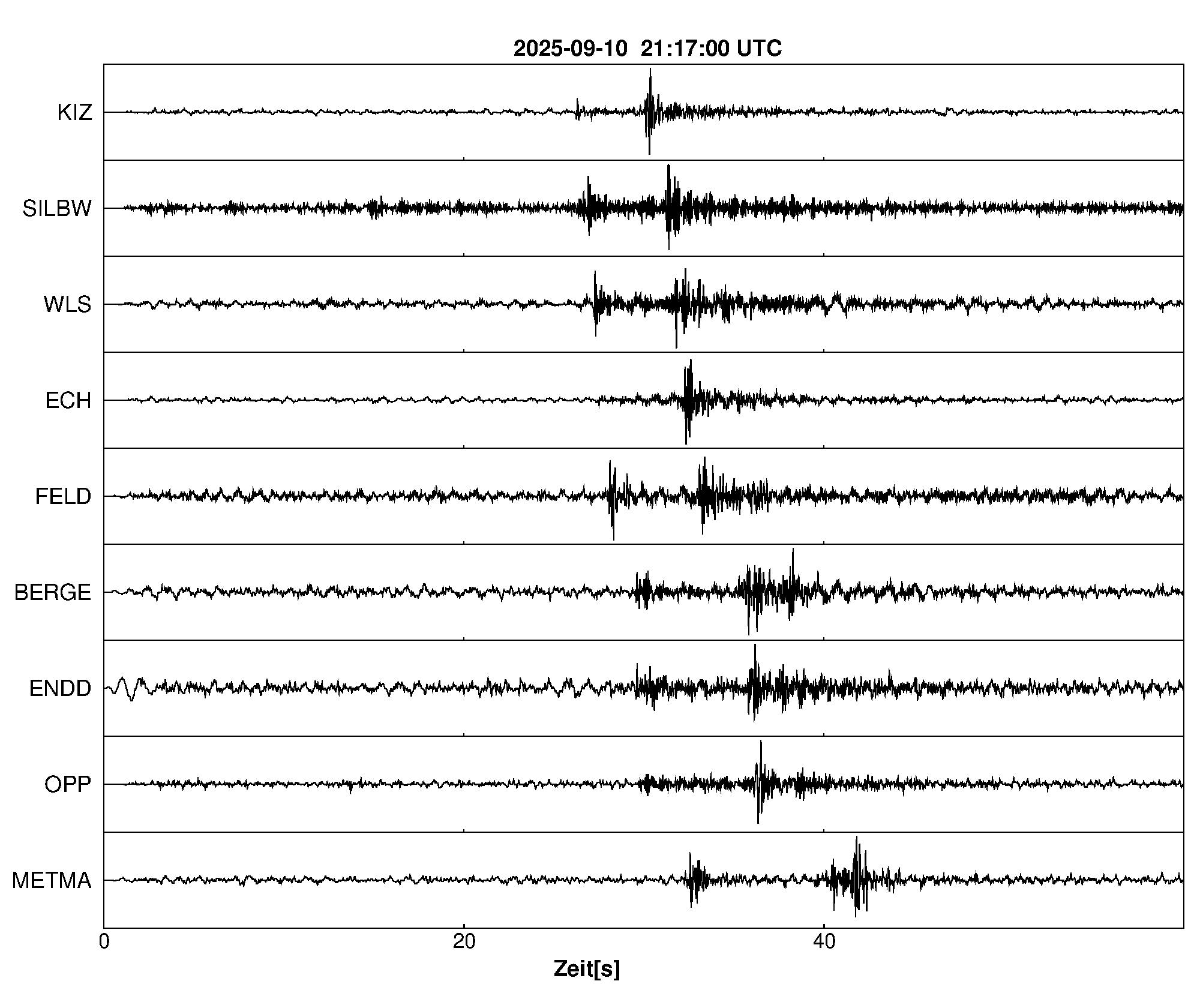 Pfadnavigation Startseite Geologischer Dienst Erdbeben Aktuelle Erdbeben Erdbeben bei Wyhl am Kaiserstuhl, Lkrs. Emmendingen, BW Teilen Erdbeben bei Wyhl am Kaiserstuhl, Lkrs. Emmendingen, BW Erdbeben bei: Wyhl am Kaiserstuhl, Lkrs. Emmendingen, BW Datum/Uhrzeit: am 10.09.2025 um 23:17 Uhr Ortszeit (MESZ) Stärke: 0.9 (Magnitude auf der Richter-Skala) Epizentrum: 48.17° N ㅤ 7.68° E Herdtiefe: ca. 12 km unter der Erdoberfläche Bemerkung: sehr schwaches Erdbeben Seismogramme ausgewählter Erdbebenmessstationen: Erläuterungen: Datum/Uhrzeit:Datum und Zeit des Erdbebens in Ortszeit, also MEZ oder MESZ; Epizentrum:Punkt an der Erdoberfläche über dem Hypozentrum (Lage des Erdbebenherdes in der Tiefe); Magnitude:Erdbebenstärke auf der Richterskala (Lokalmagnitude ML); Herdtiefe:Tiefe des Erdbebens (Hypozentrums) in Kilometern unter NN. Seismogramme:Details zu den Erdbebenmessstationen finden sich im Kartenviewer des LGRB (Baden-Württemberg) und im Kartenviewer des LGB (Rheinland-Pfalz).