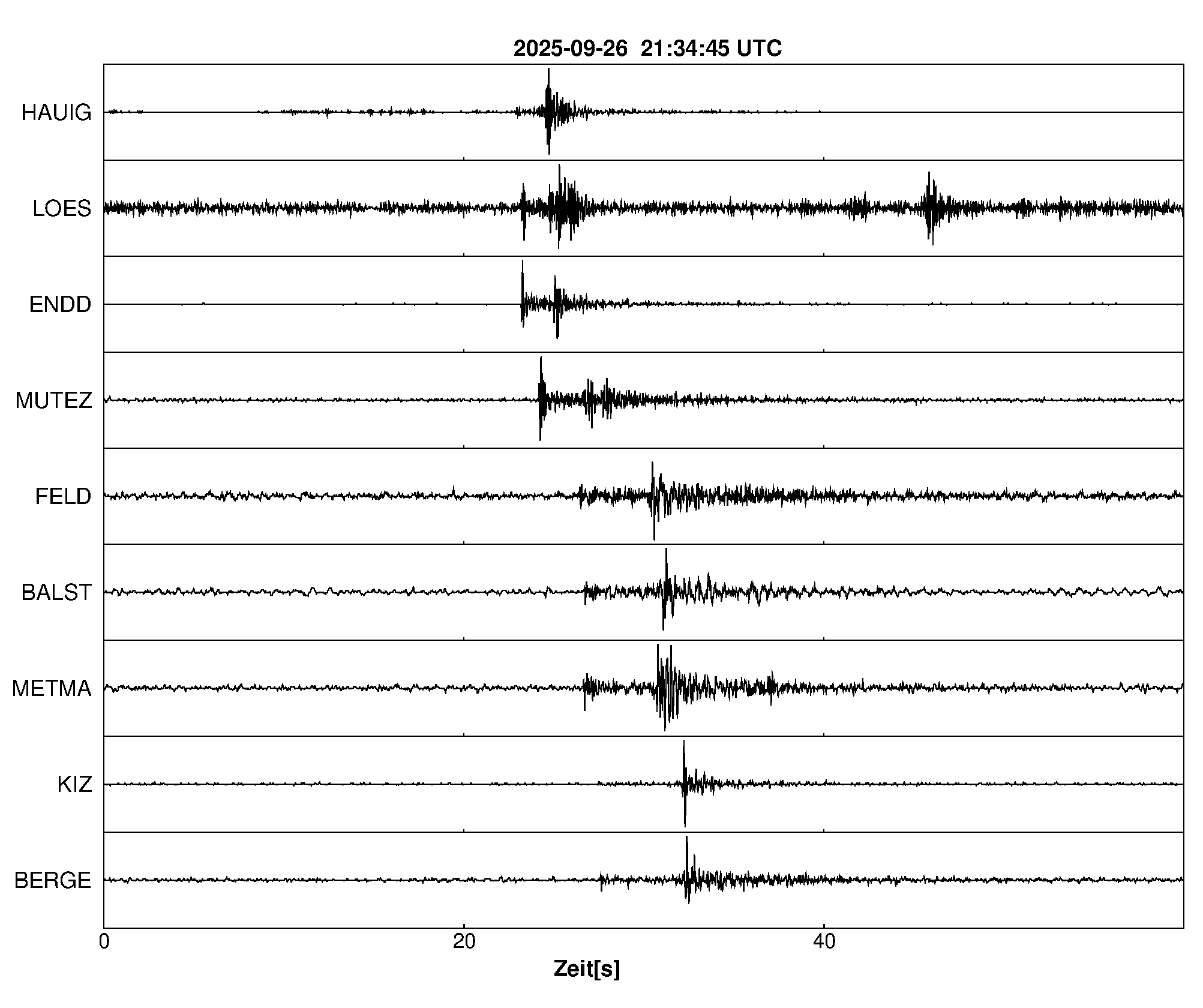 Pfadnavigation Startseite Geologischer Dienst Erdbeben Aktuelle Erdbeben Erdbeben bei Rheinfelden (Baden), Lkrs. Lörrach, BW Teilen Erdbeben bei Rheinfelden (Baden), Lkrs. Lörrach, BW Erdbeben bei: Rheinfelden (Baden), Lkrs. Lörrach, BW Datum/Uhrzeit: am 26.09.2025 um 23:35 Uhr Ortszeit (MESZ) Stärke: 0.7 (Magnitude auf der Richter-Skala) Epizentrum: 47.62° N ㅤ 7.83° E Herdtiefe: ca. 6 km unter der Erdoberfläche Bemerkung: sehr schwaches Erdbeben Seismogramme ausgewählter Erdbebenmessstationen: Erläuterungen: Datum/Uhrzeit:Datum und Zeit des Erdbebens in Ortszeit, also MEZ oder MESZ; Epizentrum:Punkt an der Erdoberfläche über dem Hypozentrum (Lage des Erdbebenherdes in der Tiefe); Magnitude:Erdbebenstärke auf der Richterskala (Lokalmagnitude ML); Herdtiefe:Tiefe des Erdbebens (Hypozentrums) in Kilometern unter NN. Seismogramme:Details zu den Erdbebenmessstationen finden sich im Kartenviewer des LGRB (Baden-Württemberg) und im Kartenviewer des LGB (Rheinland-Pfalz).