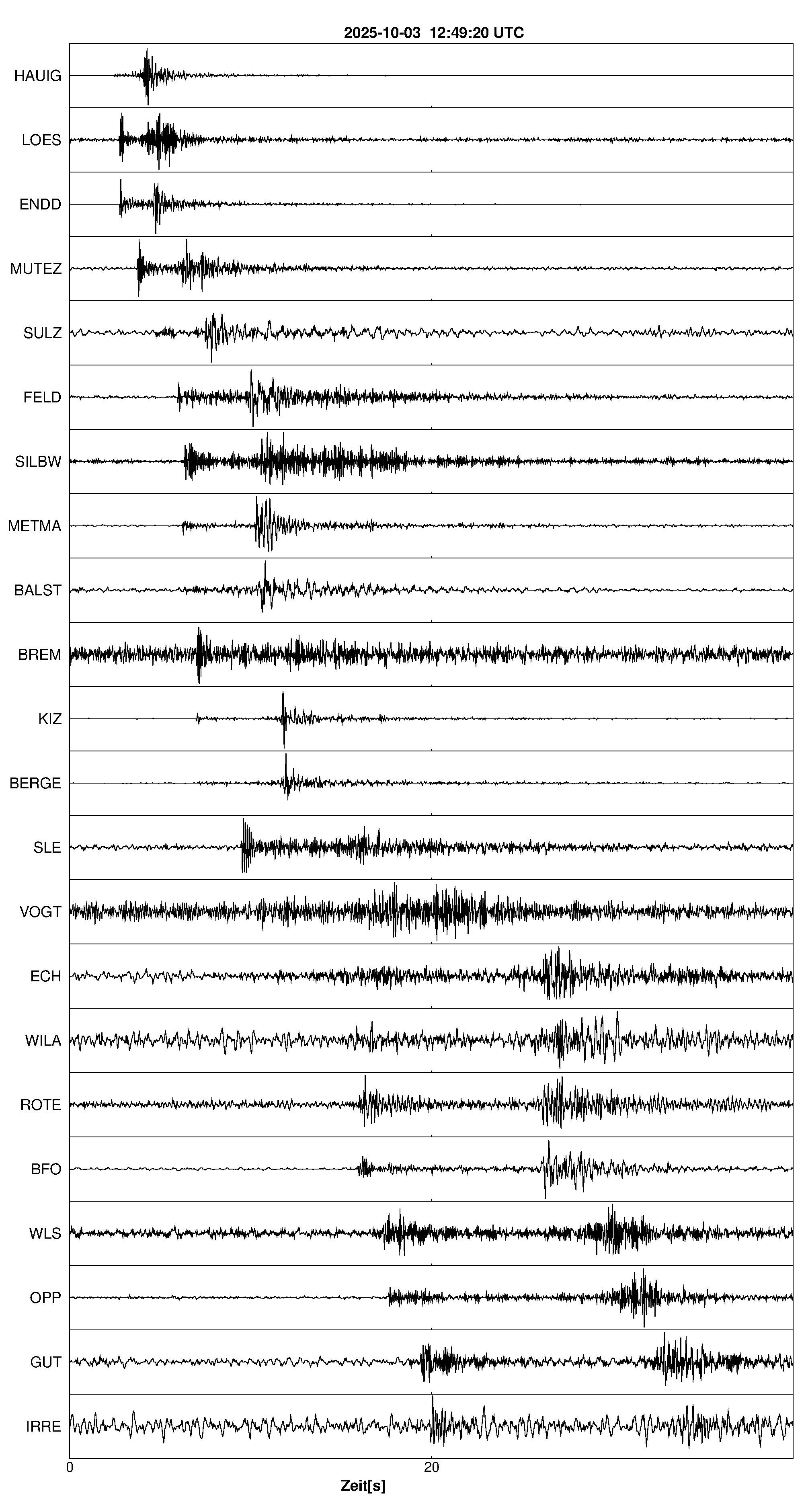 Pfadnavigation Startseite Geologischer Dienst Erdbeben Aktuelle Erdbeben Erdbeben bei Schopfheim, Lkrs. Lörrach, BW Teilen Erdbeben bei Schopfheim, Lkrs. Lörrach, BW Erdbeben bei: Schopfheim, Lkrs. Lörrach, BW Datum/Uhrzeit: am 03.10.2025 um 14:49 Uhr Ortszeit (MESZ) Stärke: 1.4 (Magnitude auf der Richter-Skala) Epizentrum: 47.62° N ㅤ 7.83° E Herdtiefe: ca. 5 km unter der Erdoberfläche Bemerkung: sehr schwaches Erdbeben Seismogramme ausgewählter Erdbebenmessstationen: Erläuterungen: Datum/Uhrzeit:Datum und Zeit des Erdbebens in Ortszeit, also MEZ oder MESZ; Epizentrum:Punkt an der Erdoberfläche über dem Hypozentrum (Lage des Erdbebenherdes in der Tiefe); Magnitude:Erdbebenstärke auf der Richterskala (Lokalmagnitude ML); Herdtiefe:Tiefe des Erdbebens (Hypozentrums) in Kilometern unter NN. Seismogramme:Details zu den Erdbebenmessstationen finden sich im Kartenviewer des LGRB (Baden-Württemberg) und im Kartenviewer des LGB (Rheinland-Pfalz).
