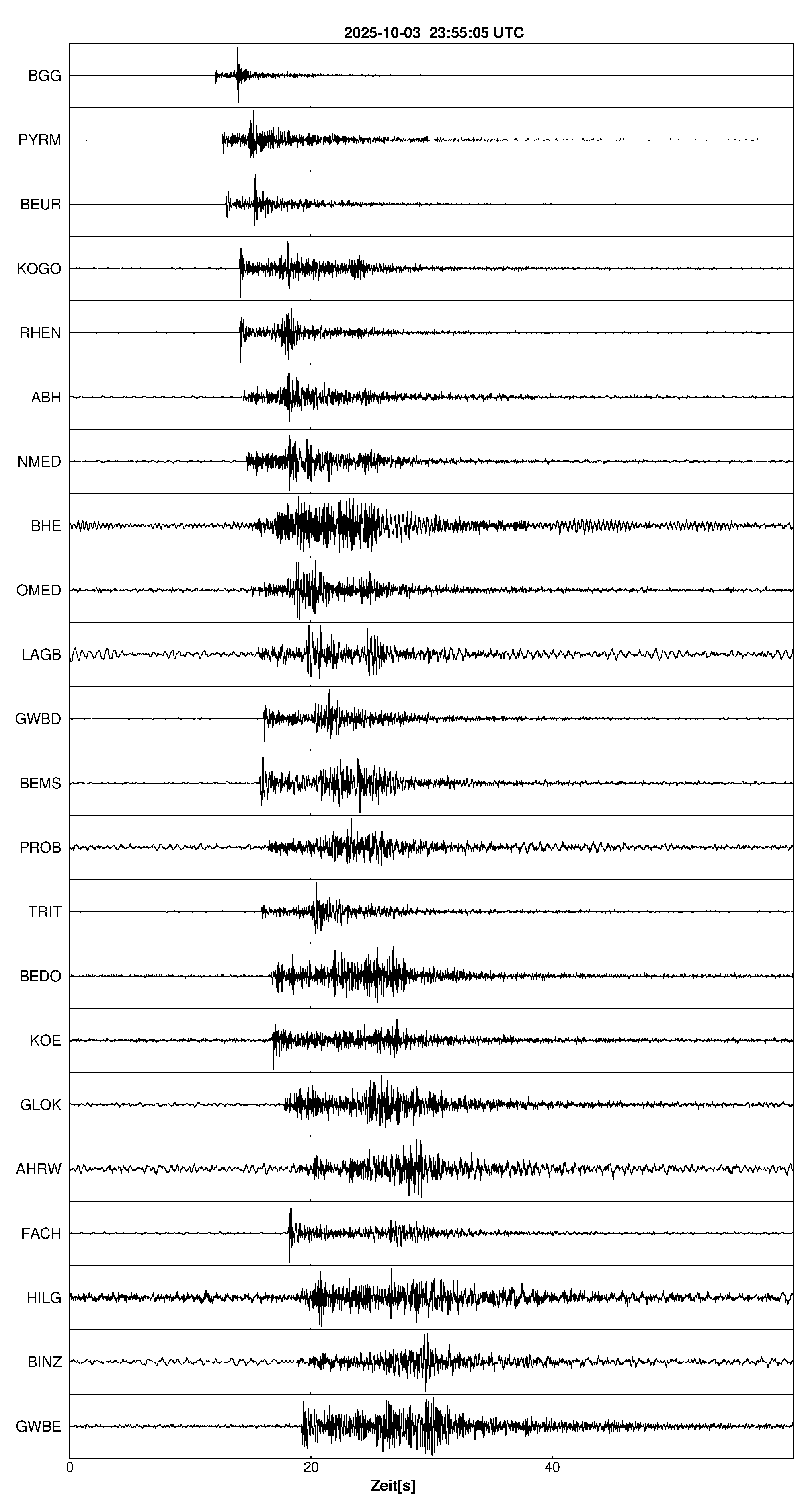 Pfadnavigation Startseite Geologischer Dienst Erdbeben Aktuelle Erdbeben Erdbeben bei Mörsdorf, Rhein-Hunsrück-Kreis, RP Teilen Erdbeben bei Mörsdorf, Rhein-Hunsrück-Kreis, RP Erdbeben bei: Mörsdorf, Rhein-Hunsrück-Kreis, RP Datum/Uhrzeit: am 04.10.2025 um 01:55 Uhr Ortszeit (MESZ) Stärke: 1.5 (Magnitude auf der Richter-Skala) Epizentrum: 50.1° N ㅤ 7.37° E Herdtiefe: ca. 9 km unter der Erdoberfläche Bemerkung: sehr schwaches Erdbeben Seismogramme ausgewählter Erdbebenmessstationen: Erläuterungen: Datum/Uhrzeit:Datum und Zeit des Erdbebens in Ortszeit, also MEZ oder MESZ; Epizentrum:Punkt an der Erdoberfläche über dem Hypozentrum (Lage des Erdbebenherdes in der Tiefe); Magnitude:Erdbebenstärke auf der Richterskala (Lokalmagnitude ML); Herdtiefe:Tiefe des Erdbebens (Hypozentrums) in Kilometern unter NN. Seismogramme:Details zu den Erdbebenmessstationen finden sich im Kartenviewer des LGRB (Baden-Württemberg) und im Kartenviewer des LGB (Rheinland-Pfalz).