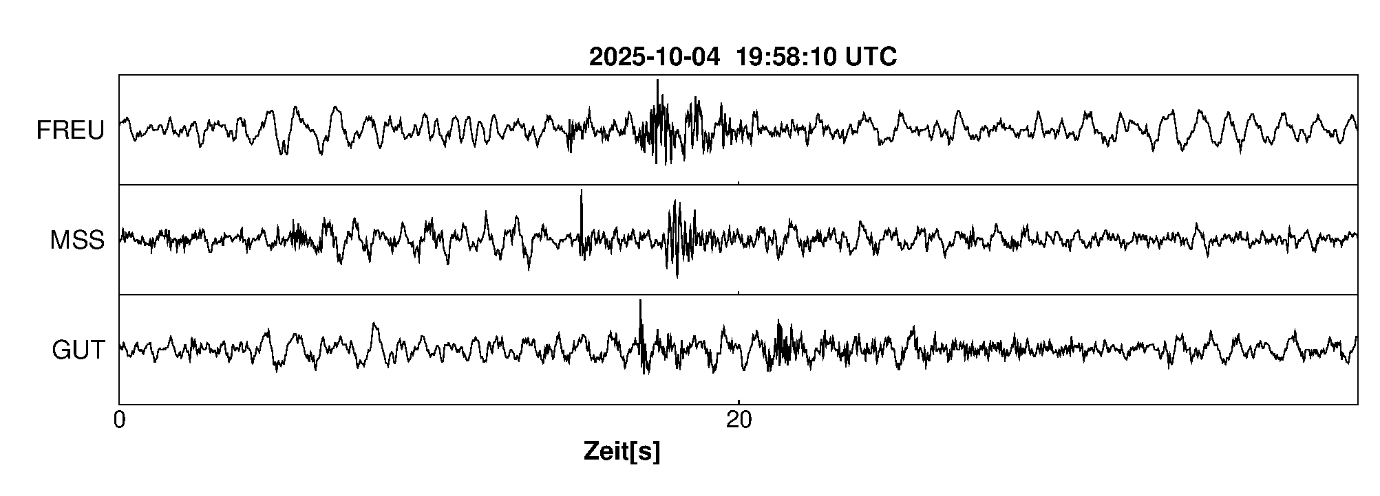 Pfadnavigation Startseite Geologischer Dienst Erdbeben Aktuelle Erdbeben Erdbeben bei Hechingen, Zollernalbkreis, BW Teilen Erdbeben bei Hechingen, Zollernalbkreis, BW Erdbeben bei: Hechingen, Zollernalbkreis, BW Datum/Uhrzeit: am 04.10.2025 um 21:58 Uhr Ortszeit (MESZ) Stärke: 0.8 (Magnitude auf der Richter-Skala) Epizentrum: 48.35° N ㅤ 8.98° E Herdtiefe: ca. 14 km unter der Erdoberfläche Bemerkung: sehr schwaches Erdbeben Seismogramme ausgewählter Erdbebenmessstationen: Erläuterungen: Datum/Uhrzeit:Datum und Zeit des Erdbebens in Ortszeit, also MEZ oder MESZ; Epizentrum:Punkt an der Erdoberfläche über dem Hypozentrum (Lage des Erdbebenherdes in der Tiefe); Magnitude:Erdbebenstärke auf der Richterskala (Lokalmagnitude ML); Herdtiefe:Tiefe des Erdbebens (Hypozentrums) in Kilometern unter NN. Seismogramme:Details zu den Erdbebenmessstationen finden sich im Kartenviewer des LGRB (Baden-Württemberg) und im Kartenviewer des LGB (Rheinland-Pfalz).