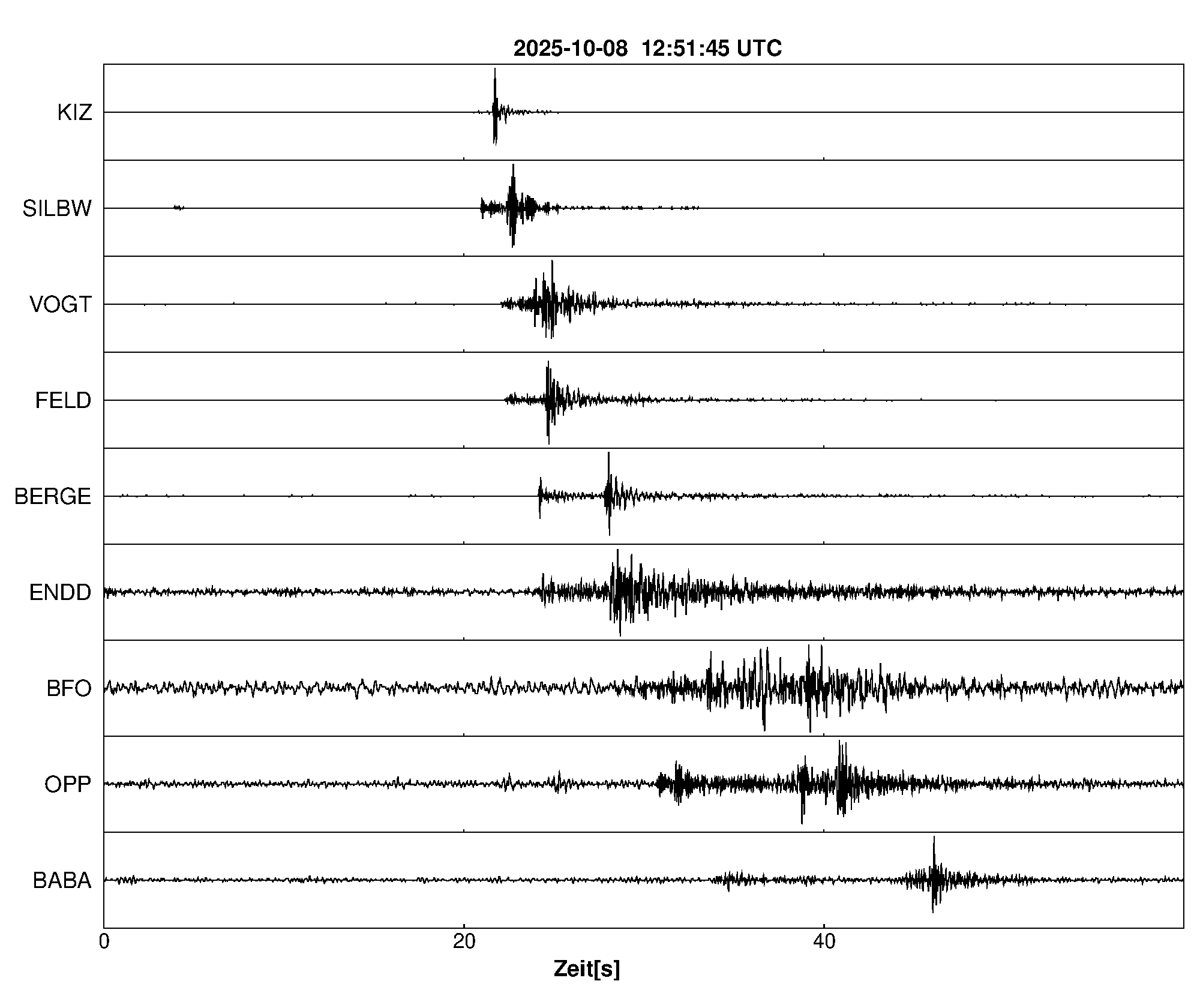 Pfadnavigation Startseite Geologischer Dienst Erdbeben Aktuelle Erdbeben Erdbeben bei Freiburg im Breisgau, BW Teilen Erdbeben bei Freiburg im Breisgau, BW Erdbeben bei: Freiburg im Breisgau, BW Datum/Uhrzeit: am 08.10.2025 um 14:52 Uhr Ortszeit (MESZ) Stärke: 1.4 (Magnitude auf der Richter-Skala) Epizentrum: 47.99° N ㅤ 7.83° E Herdtiefe: ca. 3 km unter der Erdoberfläche Bemerkung: sehr schwaches Erdbeben Seismogramme ausgewählter Erdbebenmessstationen: Erläuterungen: Datum/Uhrzeit:Datum und Zeit des Erdbebens in Ortszeit, also MEZ oder MESZ; Epizentrum:Punkt an der Erdoberfläche über dem Hypozentrum (Lage des Erdbebenherdes in der Tiefe); Magnitude:Erdbebenstärke auf der Richterskala (Lokalmagnitude ML); Herdtiefe:Tiefe des Erdbebens (Hypozentrums) in Kilometern unter NN. Seismogramme:Details zu den Erdbebenmessstationen finden sich im Kartenviewer des LGRB (Baden-Württemberg) und im Kartenviewer des LGB (Rheinland-Pfalz).