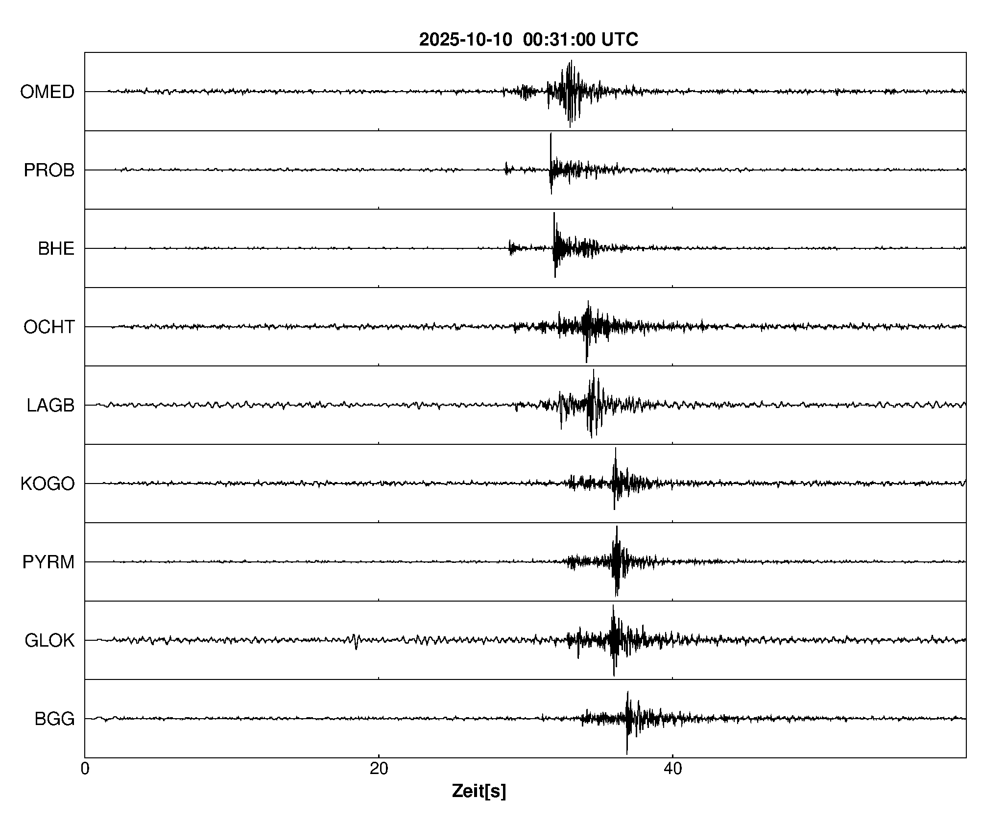 Pfadnavigation Startseite Geologischer Dienst Erdbeben Aktuelle Erdbeben Erdbeben bei Glees, Lkrs. Ahrweiler, RP Teilen Erdbeben bei Glees, Lkrs. Ahrweiler, RP Erdbeben bei: Glees, Lkrs. Ahrweiler, RP Datum/Uhrzeit: am 10.10.2025 um 02:31 Uhr Ortszeit (MESZ) Stärke: 0.6 (Magnitude auf der Richter-Skala) Epizentrum: 50.41° N ㅤ 7.25° E Herdtiefe: ca. 8 km unter der Erdoberfläche Bemerkung: sehr schwaches Erdbeben Seismogramme ausgewählter Erdbebenmessstationen: Erläuterungen: Datum/Uhrzeit:Datum und Zeit des Erdbebens in Ortszeit, also MEZ oder MESZ; Epizentrum:Punkt an der Erdoberfläche über dem Hypozentrum (Lage des Erdbebenherdes in der Tiefe); Magnitude:Erdbebenstärke auf der Richterskala (Lokalmagnitude ML); Herdtiefe:Tiefe des Erdbebens (Hypozentrums) in Kilometern unter NN. Seismogramme:Details zu den Erdbebenmessstationen finden sich im Kartenviewer des LGRB (Baden-Württemberg) und im Kartenviewer des LGB (Rheinland-Pfalz).