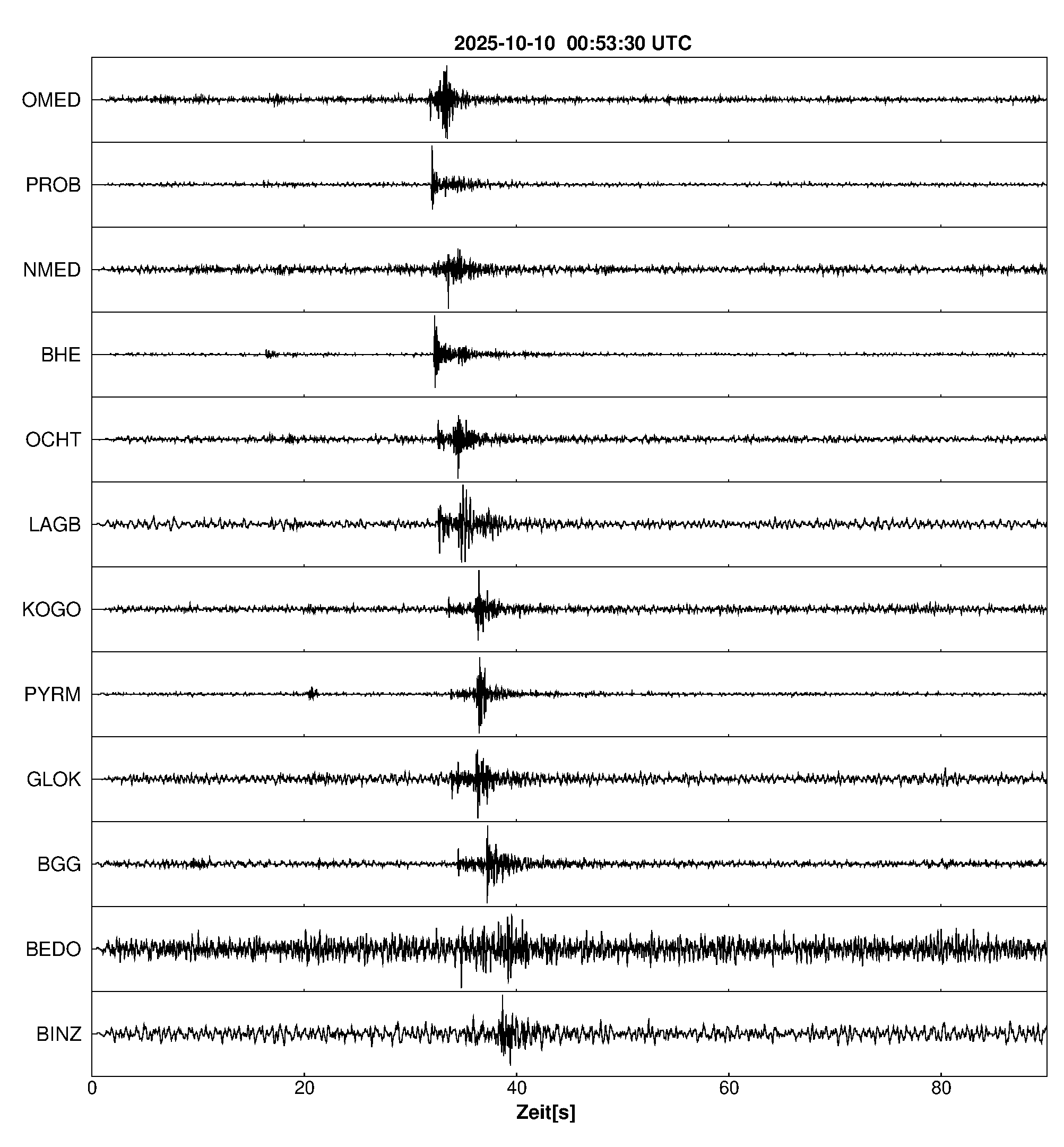 Pfadnavigation Startseite Geologischer Dienst Erdbeben Aktuelle Erdbeben Erdbeben bei Glees, Lkrs. Ahrweiler, RP Teilen Erdbeben bei Glees, Lkrs. Ahrweiler, RP Erdbeben bei: Glees, Lkrs. Ahrweiler, RP Datum/Uhrzeit: am 10.10.2025 um 02:54 Uhr Ortszeit (MESZ) Stärke: 0.6 (Magnitude auf der Richter-Skala) Epizentrum: 50.4° N ㅤ 7.25° E Herdtiefe: ca. 8 km unter der Erdoberfläche Bemerkung: sehr schwaches Erdbeben Seismogramme ausgewählter Erdbebenmessstationen: Erläuterungen: Datum/Uhrzeit:Datum und Zeit des Erdbebens in Ortszeit, also MEZ oder MESZ; Epizentrum:Punkt an der Erdoberfläche über dem Hypozentrum (Lage des Erdbebenherdes in der Tiefe); Magnitude:Erdbebenstärke auf der Richterskala (Lokalmagnitude ML); Herdtiefe:Tiefe des Erdbebens (Hypozentrums) in Kilometern unter NN. Seismogramme:Details zu den Erdbebenmessstationen finden sich im Kartenviewer des LGRB (Baden-Württemberg) und im Kartenviewer des LGB (Rheinland-Pfalz).