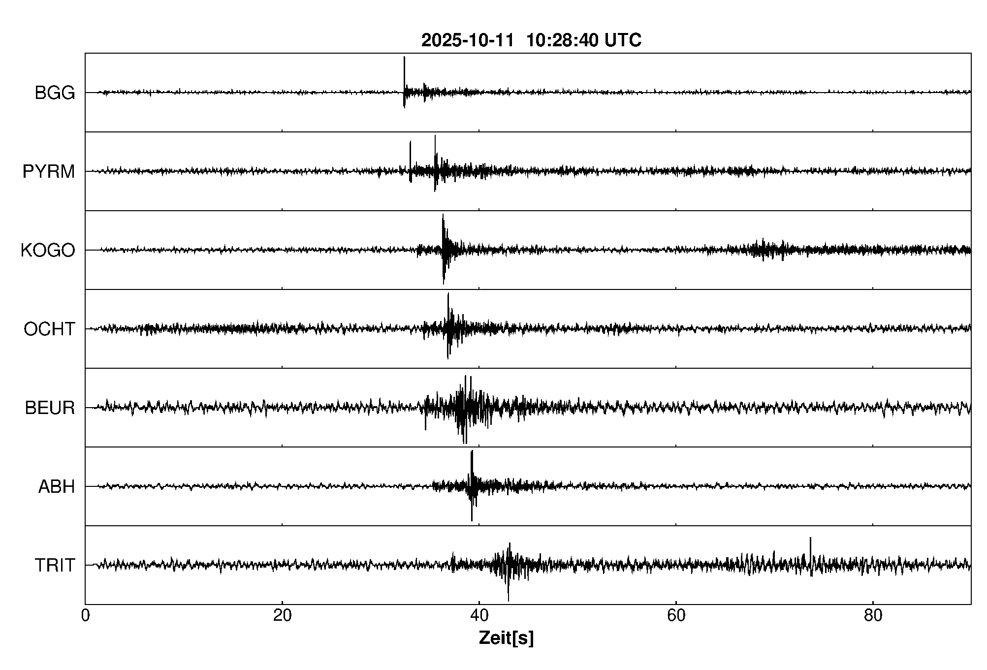 Pfadnavigation Startseite Geologischer Dienst Erdbeben Aktuelle Erdbeben Erdbeben bei Beulich, Rhein-Hunsrück-Kreis, RP Teilen Erdbeben bei Beulich, Rhein-Hunsrück-Kreis, RP Erdbeben bei: Beulich, Rhein-Hunsrück-Kreis, RP Datum/Uhrzeit: am 11.10.2025 um 12:29 Uhr Ortszeit (MESZ) Stärke: 0.5 (Magnitude auf der Richter-Skala) Epizentrum: 50.15° N ㅤ 7.45° E Herdtiefe: ca. 12 km unter der Erdoberfläche Bemerkung: sehr schwaches Erdbeben Seismogramme ausgewählter Erdbebenmessstationen: Erläuterungen: Datum/Uhrzeit:Datum und Zeit des Erdbebens in Ortszeit, also MEZ oder MESZ; Epizentrum:Punkt an der Erdoberfläche über dem Hypozentrum (Lage des Erdbebenherdes in der Tiefe); Magnitude:Erdbebenstärke auf der Richterskala (Lokalmagnitude ML); Herdtiefe:Tiefe des Erdbebens (Hypozentrums) in Kilometern unter NN. Seismogramme:Details zu den Erdbebenmessstationen finden sich im Kartenviewer des LGRB (Baden-Württemberg) und im Kartenviewer des LGB (Rheinland-Pfalz).