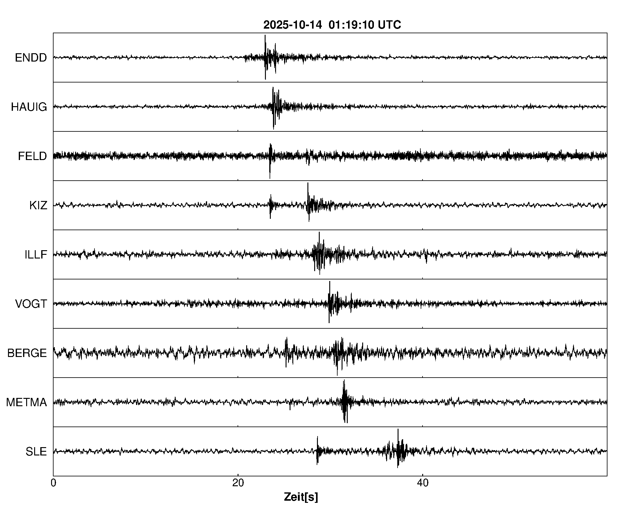 Pfadnavigation Startseite Geologischer Dienst Erdbeben Aktuelle Erdbeben Erdbeben bei Schliengen, Lkrs. Lörrach, BW Teilen Erdbeben bei Schliengen, Lkrs. Lörrach, BW Erdbeben bei: Schliengen, Lkrs. Lörrach, BW Datum/Uhrzeit: am 14.10.2025 um 03:19 Uhr Ortszeit (MESZ) Stärke: 0.7 (Magnitude auf der Richter-Skala) Epizentrum: 47.75° N ㅤ 7.68° E Herdtiefe: ca. 16 km unter der Erdoberfläche Bemerkung: sehr schwaches Erdbeben Seismogramme ausgewählter Erdbebenmessstationen: Erläuterungen: Datum/Uhrzeit:Datum und Zeit des Erdbebens in Ortszeit, also MEZ oder MESZ; Epizentrum:Punkt an der Erdoberfläche über dem Hypozentrum (Lage des Erdbebenherdes in der Tiefe); Magnitude:Erdbebenstärke auf der Richterskala (Lokalmagnitude ML); Herdtiefe:Tiefe des Erdbebens (Hypozentrums) in Kilometern unter NN. Seismogramme:Details zu den Erdbebenmessstationen finden sich im Kartenviewer des LGRB (Baden-Württemberg) und im Kartenviewer des LGB (Rheinland-Pfalz).