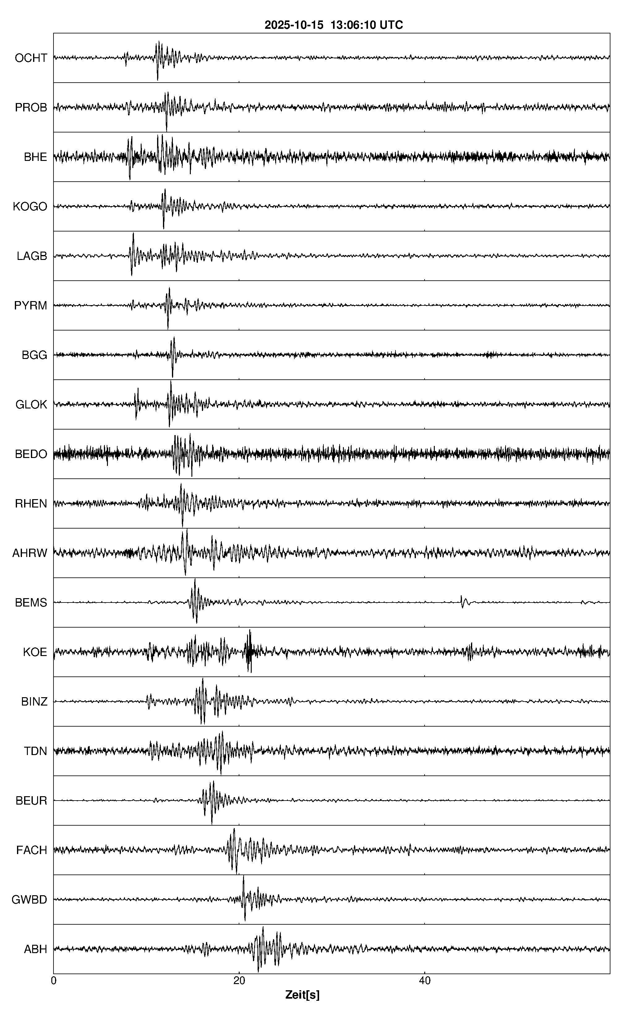 Pfadnavigation Startseite Geologischer Dienst Erdbeben Aktuelle Erdbeben Erdbeben bei Mendig, Lkrs. Mayen-Koblenz, RP Teilen Erdbeben bei Mendig, Lkrs. Mayen-Koblenz, RP Erdbeben bei: Mendig, Lkrs. Mayen-Koblenz, RP Datum/Uhrzeit: am 15.10.2025 um 15:06 Uhr Ortszeit (MESZ) Stärke: 1.5 (Magnitude auf der Richter-Skala) Epizentrum: 50.38° N ㅤ 7.3° E Herdtiefe: ca. 25 km unter der Erdoberfläche Bemerkung: sehr schwaches Erdbeben Seismogramme ausgewählter Erdbebenmessstationen: Erläuterungen: Datum/Uhrzeit:Datum und Zeit des Erdbebens in Ortszeit, also MEZ oder MESZ; Epizentrum:Punkt an der Erdoberfläche über dem Hypozentrum (Lage des Erdbebenherdes in der Tiefe); Magnitude:Erdbebenstärke auf der Richterskala (Lokalmagnitude ML); Herdtiefe:Tiefe des Erdbebens (Hypozentrums) in Kilometern unter NN. Seismogramme:Details zu den Erdbebenmessstationen finden sich im Kartenviewer des LGRB (Baden-Württemberg) und im Kartenviewer des LGB (Rheinland-Pfalz).