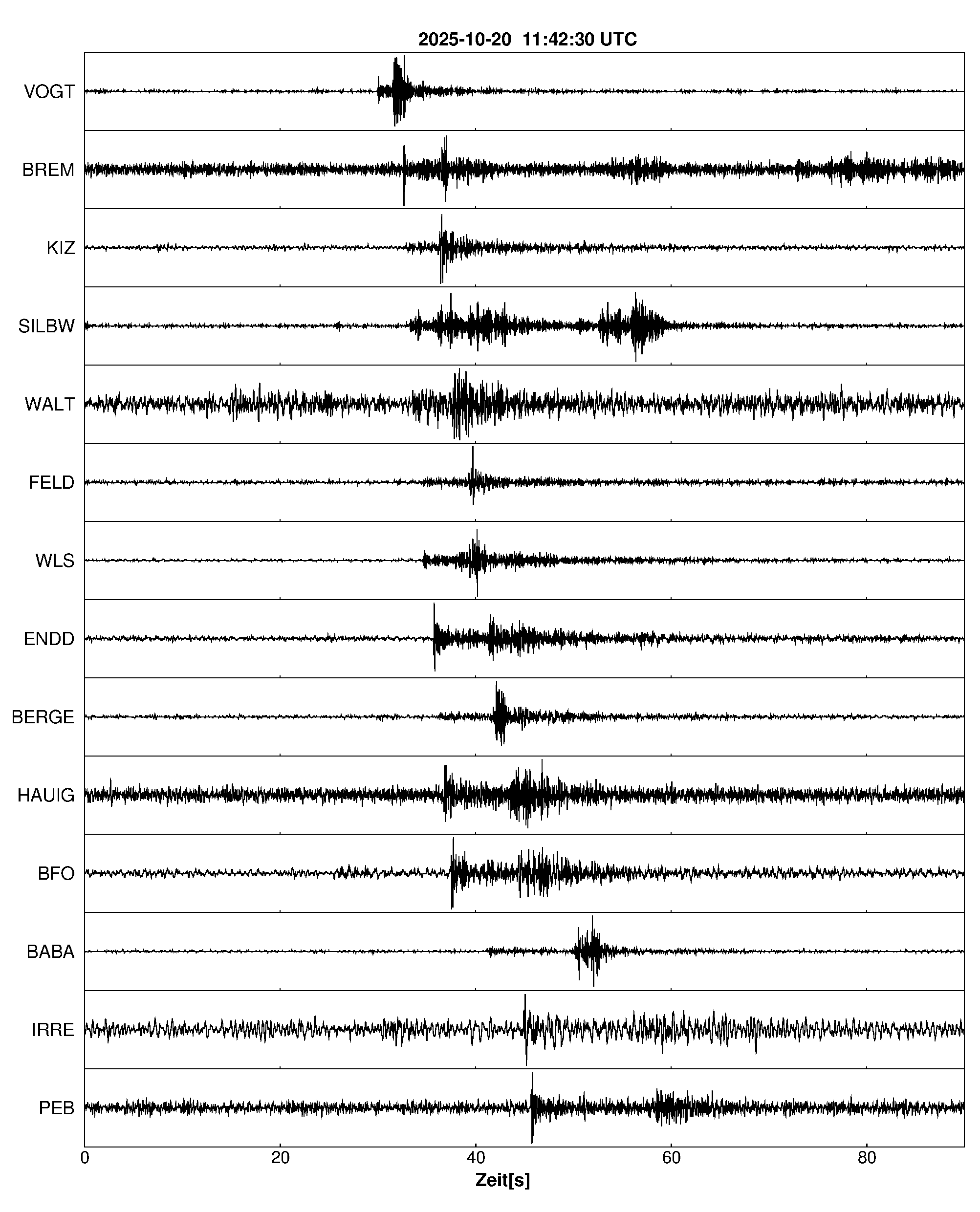 Pfadnavigation Startseite Geologischer Dienst Erdbeben Aktuelle Erdbeben Erdbeben bei Endingen am Kaiserstuhl, Lkrs. Emmendingen, BW Teilen Erdbeben bei Endingen am Kaiserstuhl, Lkrs. Emmendingen, BW Erdbeben bei: Endingen am Kaiserstuhl, Lkrs. Emmendingen, BW Datum/Uhrzeit: am 20.10.2025 um 13:42 Uhr Ortszeit (MESZ) Stärke: 1.4 (Magnitude auf der Richter-Skala) Epizentrum: 48.12° N ㅤ 7.65° E Herdtiefe: ca. 9 km unter der Erdoberfläche Bemerkung: sehr schwaches Erdbeben Seismogramme ausgewählter Erdbebenmessstationen: Erläuterungen: Datum/Uhrzeit:Datum und Zeit des Erdbebens in Ortszeit, also MEZ oder MESZ; Epizentrum:Punkt an der Erdoberfläche über dem Hypozentrum (Lage des Erdbebenherdes in der Tiefe); Magnitude:Erdbebenstärke auf der Richterskala (Lokalmagnitude ML); Herdtiefe:Tiefe des Erdbebens (Hypozentrums) in Kilometern unter NN. Seismogramme:Details zu den Erdbebenmessstationen finden sich im Kartenviewer des LGRB (Baden-Württemberg) und im Kartenviewer des LGB (Rheinland-Pfalz).