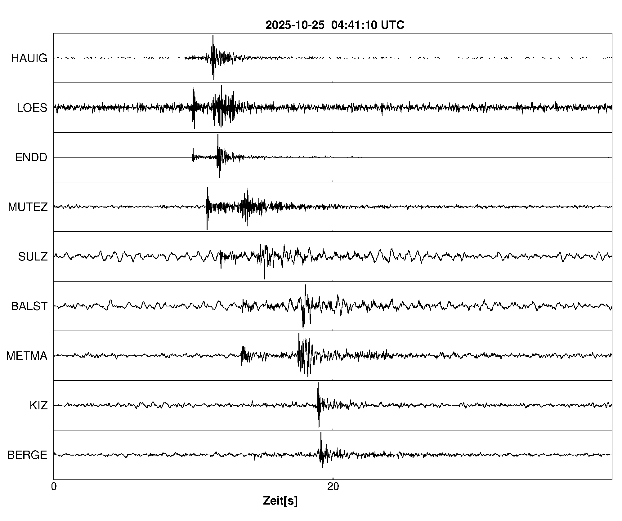 Pfadnavigation Startseite Geologischer Dienst Erdbeben Aktuelle Erdbeben Erdbeben bei Rheinfelden, Lkrs. Lörrach, BW Teilen Erdbeben bei Rheinfelden, Lkrs. Lörrach, BW Erdbeben bei: Rheinfelden, Lkrs. Lörrach, BW Datum/Uhrzeit: am 25.10.2025 um 06:41 Uhr Ortszeit (MESZ) Stärke: 0.6 (Magnitude auf der Richter-Skala) Epizentrum: 47.62° N ㅤ 7.82° E Herdtiefe: ca. 5 km unter der Erdoberfläche Bemerkung: sehr schwaches Erdbeben Seismogramme ausgewählter Erdbebenmessstationen: Erläuterungen: Datum/Uhrzeit:Datum und Zeit des Erdbebens in Ortszeit, also MEZ oder MESZ; Epizentrum:Punkt an der Erdoberfläche über dem Hypozentrum (Lage des Erdbebenherdes in der Tiefe); Magnitude:Erdbebenstärke auf der Richterskala (Lokalmagnitude ML); Herdtiefe:Tiefe des Erdbebens (Hypozentrums) in Kilometern unter NN. Seismogramme:Details zu den Erdbebenmessstationen finden sich im Kartenviewer des LGRB (Baden-Württemberg) und im Kartenviewer des LGB (Rheinland-Pfalz).