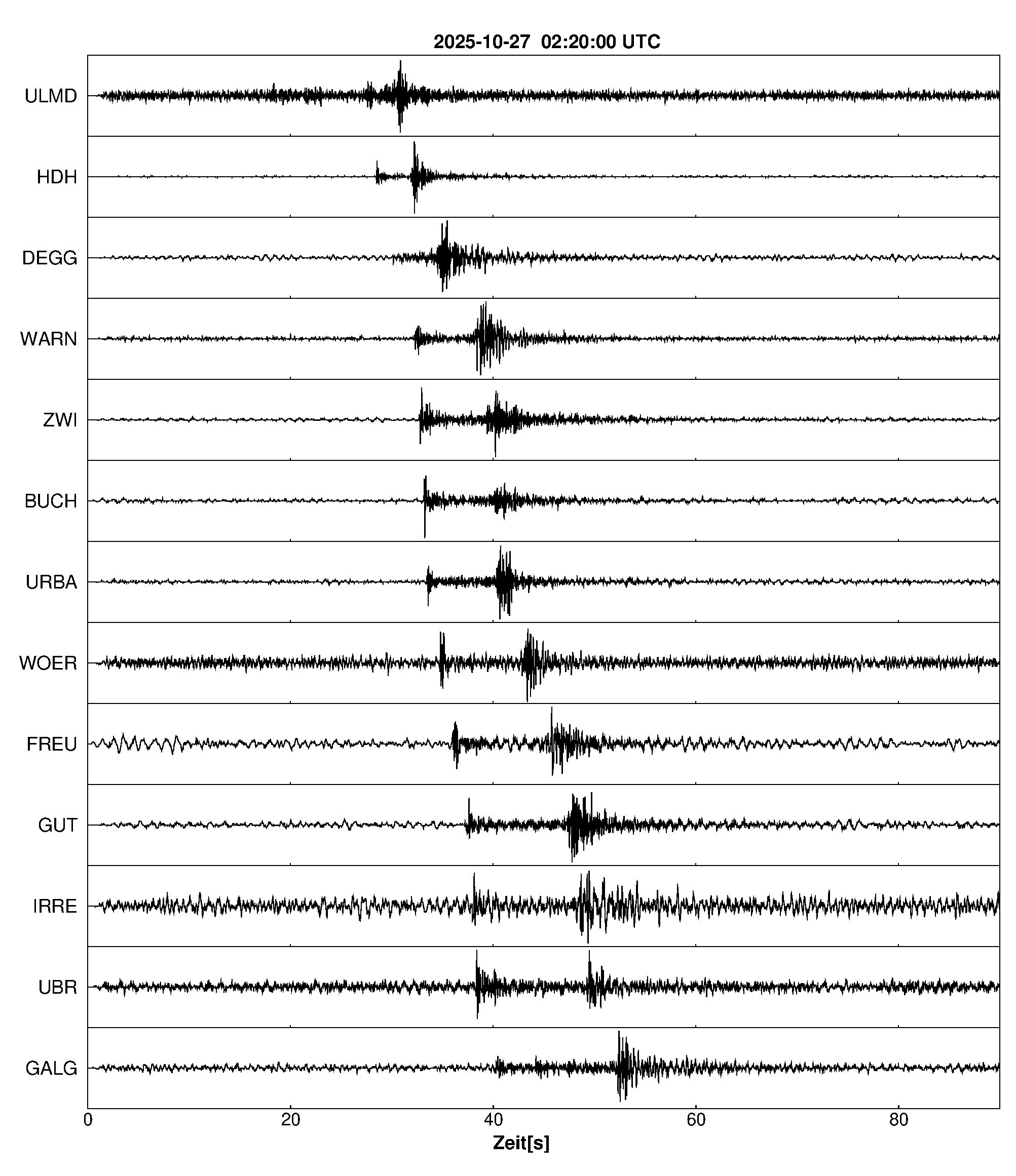 Pfadnavigation Startseite Geologischer Dienst Erdbeben Aktuelle Erdbeben Erdbeben bei Elchingen, Lkrs. Neu-Ulm, Bayern Teilen Erdbeben bei Elchingen, Lkrs. Neu-Ulm, Bayern Erdbeben außerhalb von Baden-Württemberg und Rheinland-Pfalz:Die maßgeblichen Angaben veröffentlicht der lokal zuständige Erdbebendienst. Erdbeben bei: Elchingen, Lkrs. Neu-Ulm, Bayern Datum/Uhrzeit: am 27.10.2025 um 03:20 Uhr Ortszeit (MEZ) Stärke: 1.5 (Magnitude auf der Richter-Skala) Epizentrum: 48.46° N ㅤ 10.06° E Herdtiefe: ca. 23 km unter der Erdoberfläche Bemerkung: sehr schwaches Erdbeben Seismogramme ausgewählter Erdbebenmessstationen: Erläuterungen: Datum/Uhrzeit:Datum und Zeit des Erdbebens in Ortszeit, also MEZ oder MESZ; Epizentrum:Punkt an der Erdoberfläche über dem Hypozentrum (Lage des Erdbebenherdes in der Tiefe); Magnitude:Erdbebenstärke auf der Richterskala (Lokalmagnitude ML); Herdtiefe:Tiefe des Erdbebens (Hypozentrums) in Kilometern unter NN. Seismogramme:Details zu den Erdbebenmessstationen finden sich im Kartenviewer des LGRB (Baden-Württemberg) und im Kartenviewer des LGB (Rheinland-Pfalz).