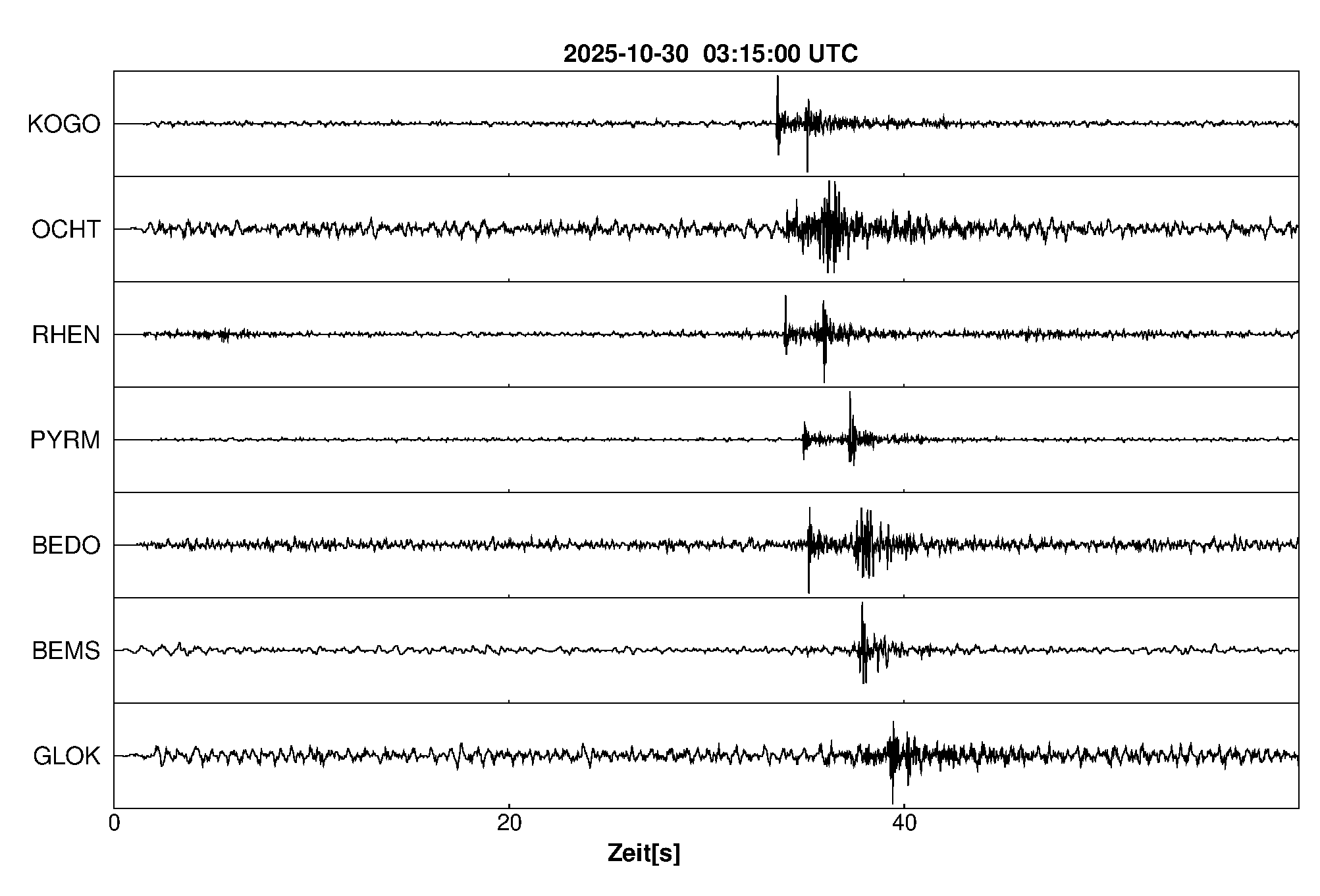 Pfadnavigation Startseite Geologischer Dienst Erdbeben Aktuelle Erdbeben Erdbeben bei Dieblich, Lkrs. Mayen-Koblenz, RP Teilen Erdbeben bei Dieblich, Lkrs. Mayen-Koblenz, RP Erdbeben bei: Dieblich, Lkrs. Mayen-Koblenz, RP Datum/Uhrzeit: am 30.10.2025 um 04:15 Uhr Ortszeit (MEZ) Stärke: 0.7 (Magnitude auf der Richter-Skala) Epizentrum: 50.32° N ㅤ 7.47° E Herdtiefe: ca. 12 km unter der Erdoberfläche Bemerkung: sehr schwaches Erdbeben Seismogramme ausgewählter Erdbebenmessstationen: Erläuterungen: Datum/Uhrzeit:Datum und Zeit des Erdbebens in Ortszeit, also MEZ oder MESZ; Epizentrum:Punkt an der Erdoberfläche über dem Hypozentrum (Lage des Erdbebenherdes in der Tiefe); Magnitude:Erdbebenstärke auf der Richterskala (Lokalmagnitude ML); Herdtiefe:Tiefe des Erdbebens (Hypozentrums) in Kilometern unter NN. Seismogramme:Details zu den Erdbebenmessstationen finden sich im Kartenviewer des LGRB (Baden-Württemberg) und im Kartenviewer des LGB (Rheinland-Pfalz).