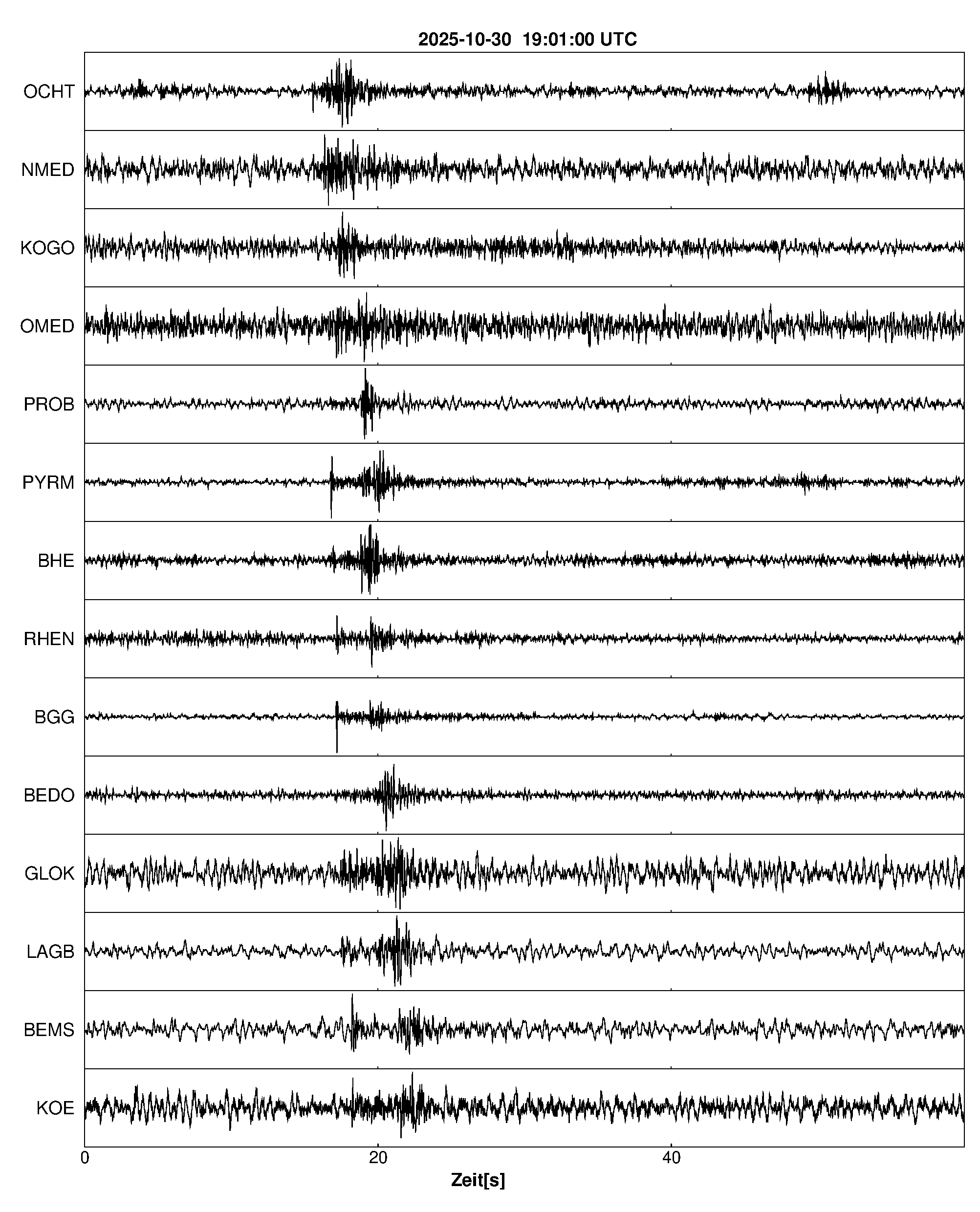 Pfadnavigation Startseite Geologischer Dienst Erdbeben Aktuelle Erdbeben Erdbeben bei Ochtendung, Lkrs. Mayen-Koblenz, RP Teilen Erdbeben bei Ochtendung, Lkrs. Mayen-Koblenz, RP Erdbeben bei: Ochtendung, Lkrs. Mayen-Koblenz, RP Datum/Uhrzeit: am 30.10.2025 um 20:01 Uhr Ortszeit (MEZ) Stärke: 0.5 (Magnitude auf der Richter-Skala) Epizentrum: 50.36° N ㅤ 7.39° E Herdtiefe: ca. 11 km unter der Erdoberfläche Bemerkung: sehr schwaches Erdbeben Seismogramme ausgewählter Erdbebenmessstationen: Erläuterungen: Datum/Uhrzeit:Datum und Zeit des Erdbebens in Ortszeit, also MEZ oder MESZ; Epizentrum:Punkt an der Erdoberfläche über dem Hypozentrum (Lage des Erdbebenherdes in der Tiefe); Magnitude:Erdbebenstärke auf der Richterskala (Lokalmagnitude ML); Herdtiefe:Tiefe des Erdbebens (Hypozentrums) in Kilometern unter NN. Seismogramme:Details zu den Erdbebenmessstationen finden sich im Kartenviewer des LGRB (Baden-Württemberg) und im Kartenviewer des LGB (Rheinland-Pfalz).