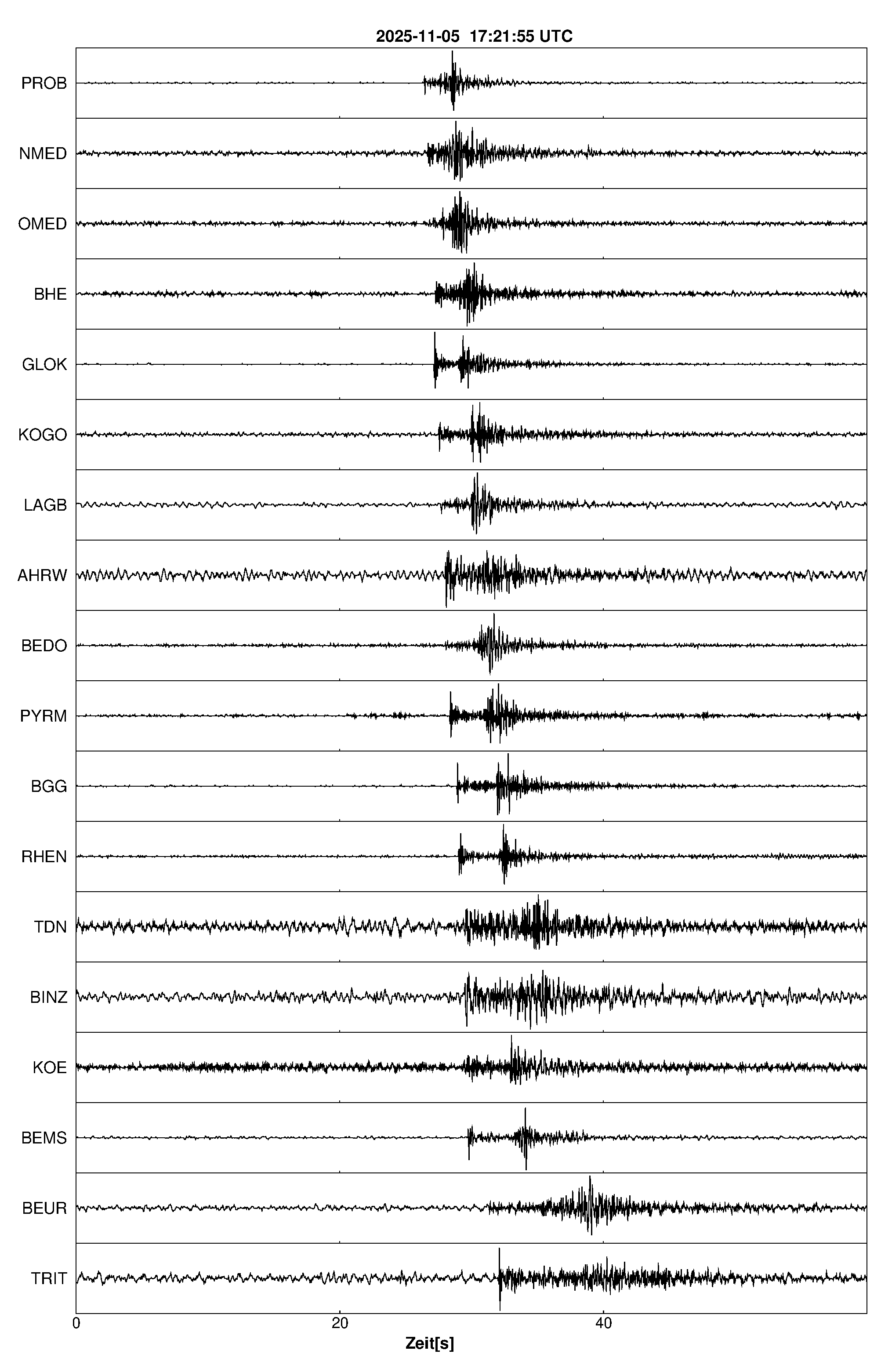 Pfadnavigation Startseite Geologischer Dienst Erdbeben Aktuelle Erdbeben Erdbeben bei Andernach, Lkrs. Mayen-Koblenz, RP Teilen Erdbeben bei Andernach, Lkrs. Mayen-Koblenz, RP Erdbeben bei: Andernach, Lkrs. Mayen-Koblenz, RP Datum/Uhrzeit: am 05.11.2025 um 18:22 Uhr Ortszeit (MEZ) Stärke: 1.2 (Magnitude auf der Richter-Skala) Epizentrum: 50.44° N ㅤ 7.31° E Herdtiefe: ca. 13 km unter der Erdoberfläche Bemerkung: sehr schwaches Erdbeben Seismogramme ausgewählter Erdbebenmessstationen: Erläuterungen: Datum/Uhrzeit:Datum und Zeit des Erdbebens in Ortszeit, also MEZ oder MESZ; Epizentrum:Punkt an der Erdoberfläche über dem Hypozentrum (Lage des Erdbebenherdes in der Tiefe); Magnitude:Erdbebenstärke auf der Richterskala (Lokalmagnitude ML); Herdtiefe:Tiefe des Erdbebens (Hypozentrums) in Kilometern unter NN. Seismogramme:Details zu den Erdbebenmessstationen finden sich im Kartenviewer des LGRB (Baden-Württemberg) und im Kartenviewer des LGB (Rheinland-Pfalz).