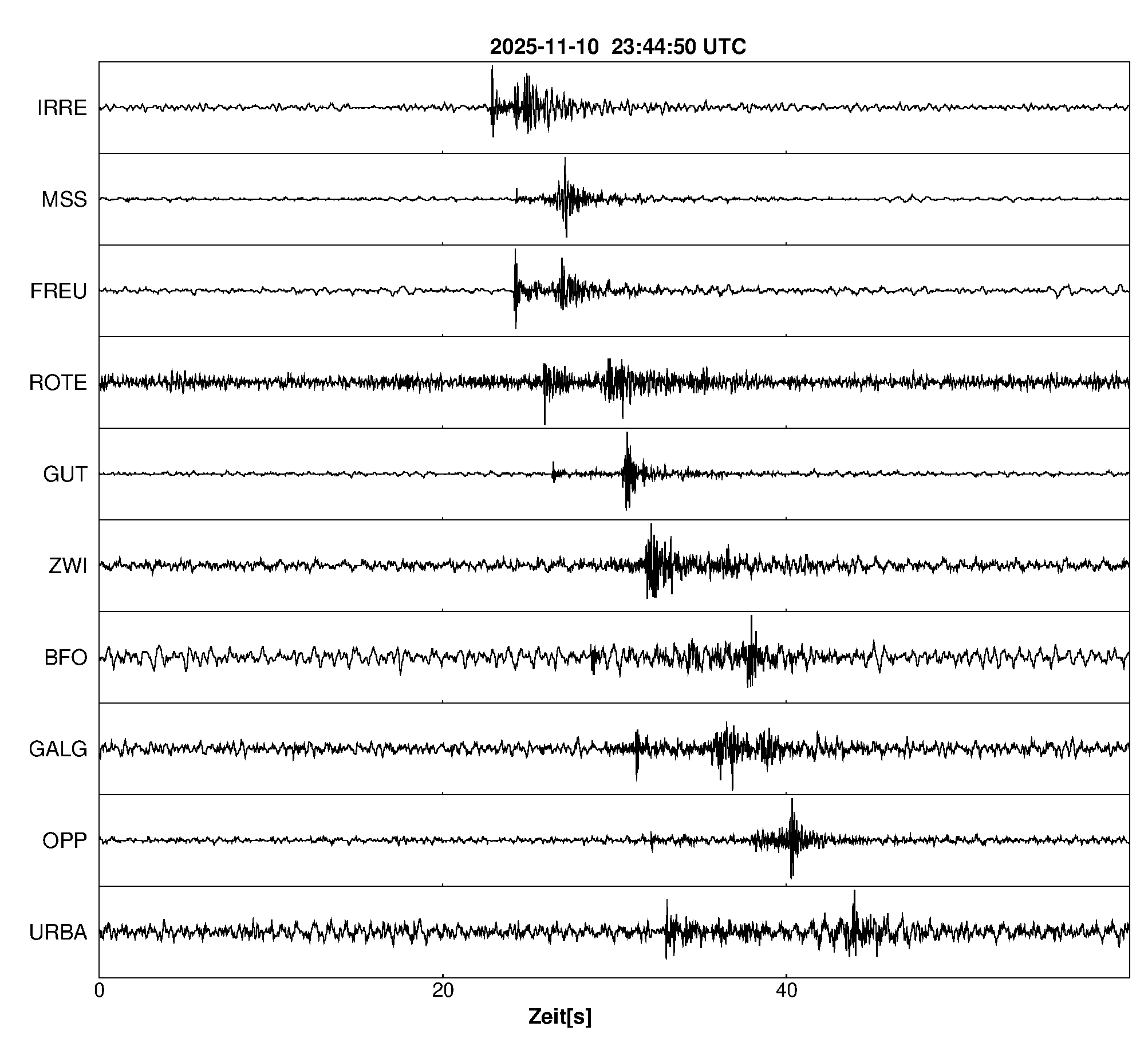 Pfadnavigation Startseite Geologischer Dienst Erdbeben Aktuelle Erdbeben Erdbeben bei Hechingen, Zollernalbkreis, BW Teilen Erdbeben bei Hechingen, Zollernalbkreis, BW Erdbeben bei: Hechingen, Zollernalbkreis, BW Datum/Uhrzeit: am 11.11.2025 um 00:45 Uhr Ortszeit (MEZ) Stärke: 0.9 (Magnitude auf der Richter-Skala) Epizentrum: 48.34° N ㅤ 8.95° E Herdtiefe: ca. 11 km unter der Erdoberfläche Bemerkung: sehr schwaches Erdbeben Seismogramme ausgewählter Erdbebenmessstationen: Erläuterungen: Datum/Uhrzeit:Datum und Zeit des Erdbebens in Ortszeit, also MEZ oder MESZ; Epizentrum:Punkt an der Erdoberfläche über dem Hypozentrum (Lage des Erdbebenherdes in der Tiefe); Magnitude:Erdbebenstärke auf der Richterskala (Lokalmagnitude ML); Herdtiefe:Tiefe des Erdbebens (Hypozentrums) in Kilometern unter NN. Seismogramme:Details zu den Erdbebenmessstationen finden sich im Kartenviewer des LGRB (Baden-Württemberg) und im Kartenviewer des LGB (Rheinland-Pfalz).