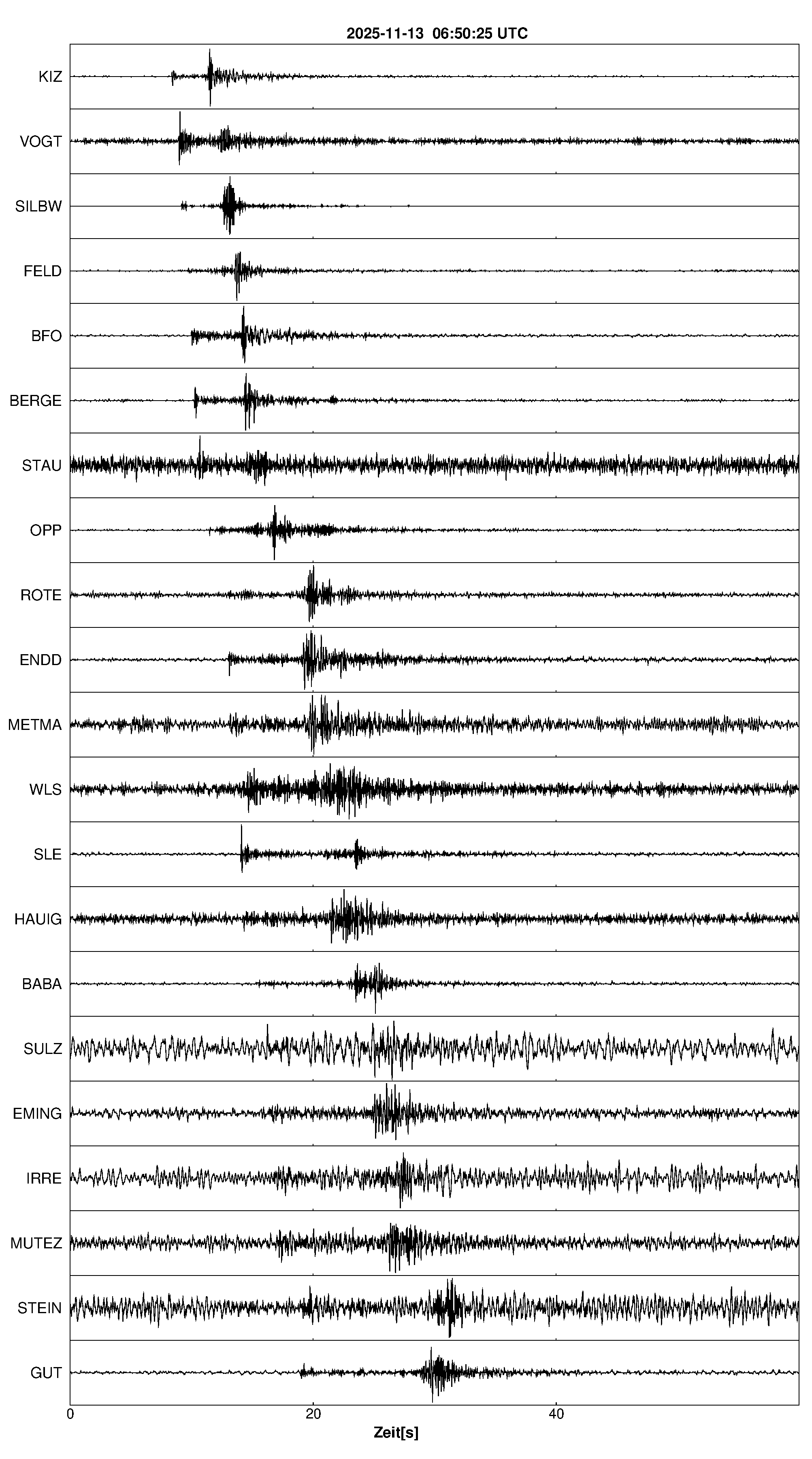 Pfadnavigation Startseite Geologischer Dienst Erdbeben Aktuelle Erdbeben Erdbeben bei Gutach im Breisgau, Lkrs. Emmendingen, BW Teilen Erdbeben bei Gutach im Breisgau, Lkrs. Emmendingen, BW Erdbeben bei: Gutach im Breisgau, Lkrs. Emmendingen, BW Datum/Uhrzeit: am 13.11.2025 um 07:50 Uhr Ortszeit (MEZ) Stärke: 1.4 (Magnitude auf der Richter-Skala) Epizentrum: 48.14° N ㅤ 7.99° E Herdtiefe: ca. 5 km unter der Erdoberfläche Bemerkung: sehr schwaches Erdbeben Seismogramme ausgewählter Erdbebenmessstationen: Erläuterungen: Datum/Uhrzeit:Datum und Zeit des Erdbebens in Ortszeit, also MEZ oder MESZ; Epizentrum:Punkt an der Erdoberfläche über dem Hypozentrum (Lage des Erdbebenherdes in der Tiefe); Magnitude:Erdbebenstärke auf der Richterskala (Lokalmagnitude ML); Herdtiefe:Tiefe des Erdbebens (Hypozentrums) in Kilometern unter NN. Seismogramme:Details zu den Erdbebenmessstationen finden sich im Kartenviewer des LGRB (Baden-Württemberg) und im Kartenviewer des LGB (Rheinland-Pfalz).