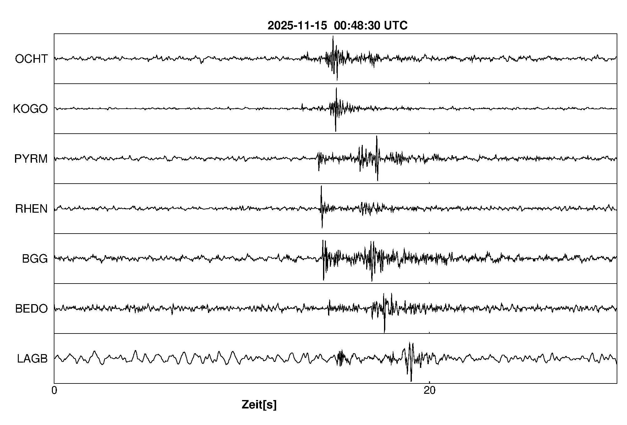 Pfadnavigation Startseite Geologischer Dienst Erdbeben Aktuelle Erdbeben Erdbeben bei Ochtendung, Lkrs. Mayen-Koblenz, RP Teilen Erdbeben bei Ochtendung, Lkrs. Mayen-Koblenz, RP Erdbeben bei: Ochtendung, Lkrs. Mayen-Koblenz, RP Datum/Uhrzeit: am 15.11.2025 um 01:48 Uhr Ortszeit (MEZ) Stärke: 0.5 (Magnitude auf der Richter-Skala) Epizentrum: 50.34° N ㅤ 7.41° E Herdtiefe: ca. 12 km unter der Erdoberfläche Bemerkung: sehr schwaches Erdbeben Seismogramme ausgewählter Erdbebenmessstationen: Erläuterungen: Datum/Uhrzeit:Datum und Zeit des Erdbebens in Ortszeit, also MEZ oder MESZ; Epizentrum:Punkt an der Erdoberfläche über dem Hypozentrum (Lage des Erdbebenherdes in der Tiefe); Magnitude:Erdbebenstärke auf der Richterskala (Lokalmagnitude ML); Herdtiefe:Tiefe des Erdbebens (Hypozentrums) in Kilometern unter NN. Seismogramme:Details zu den Erdbebenmessstationen finden sich im Kartenviewer des LGRB (Baden-Württemberg) und im Kartenviewer des LGB (Rheinland-Pfalz).