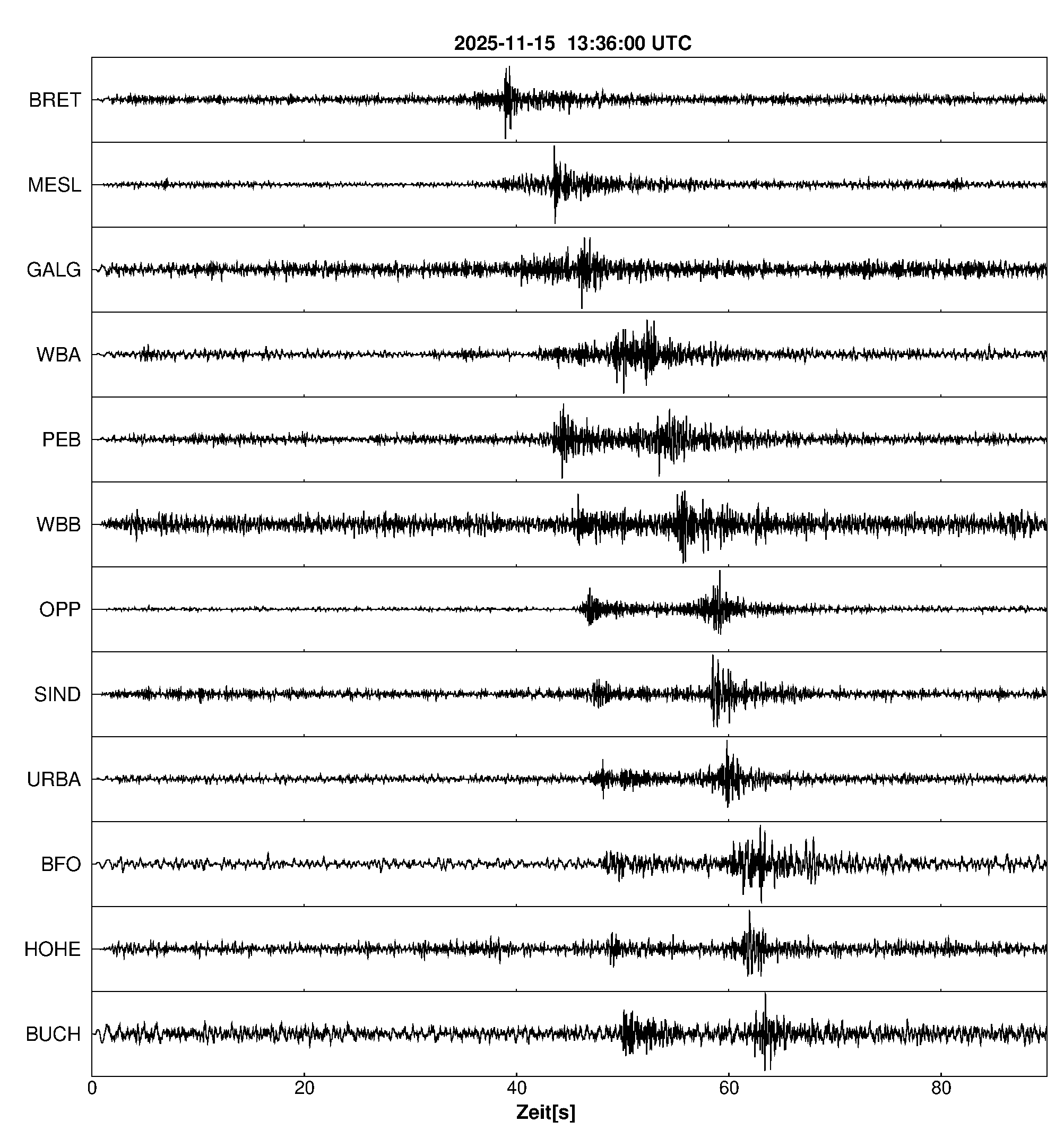 Pfadnavigation Startseite Geologischer Dienst Erdbeben Aktuelle Erdbeben Erdbeben bei Bruchsal, Lkrs. Karlsruhe, BW Teilen Erdbeben bei Bruchsal, Lkrs. Karlsruhe, BW Erdbeben bei: Bruchsal, Lkrs. Karlsruhe, BW Datum/Uhrzeit: am 15.11.2025 um 14:36 Uhr Ortszeit (MEZ) Stärke: 1.3 (Magnitude auf der Richter-Skala) Epizentrum: 49.18° N ㅤ 8.53° E Herdtiefe: ca. 4 km unter der Erdoberfläche Bemerkung: wahrscheinlich induziertes Erdbeben; sehr schwaches Erdbeben Seismogramme ausgewählter Erdbebenmessstationen: Erläuterungen: Datum/Uhrzeit:Datum und Zeit des Erdbebens in Ortszeit, also MEZ oder MESZ; Epizentrum:Punkt an der Erdoberfläche über dem Hypozentrum (Lage des Erdbebenherdes in der Tiefe); Magnitude:Erdbebenstärke auf der Richterskala (Lokalmagnitude ML); Herdtiefe:Tiefe des Erdbebens (Hypozentrums) in Kilometern unter NN. Seismogramme:Details zu den Erdbebenmessstationen finden sich im Kartenviewer des LGRB (Baden-Württemberg) und im Kartenviewer des LGB (Rheinland-Pfalz).