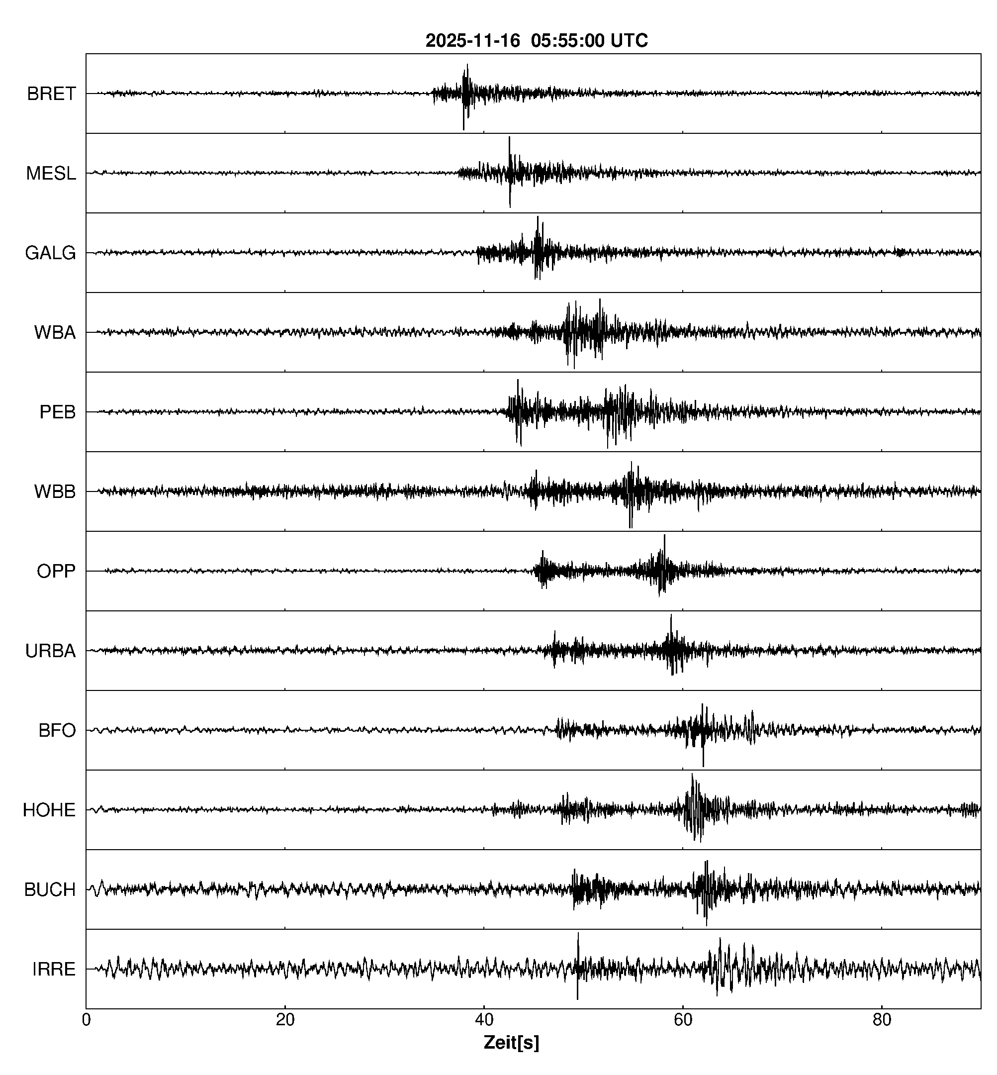 Pfadnavigation Startseite Geologischer Dienst Erdbeben Aktuelle Erdbeben Erdbeben bei Bruchsal, Lkrs. Karlsruhe, BW Teilen Erdbeben bei Bruchsal, Lkrs. Karlsruhe, BW Erdbeben bei: Bruchsal, Lkrs. Karlsruhe, BW Datum/Uhrzeit: am 16.11.2025 um 06:55 Uhr Ortszeit (MEZ) Stärke: 1.2 (Magnitude auf der Richter-Skala) Epizentrum: 49.18° N ㅤ 8.53° E Herdtiefe: ca. 5 km unter der Erdoberfläche Bemerkung: wahrscheinlich induziertes Erdbeben; sehr schwaches Erdbeben Seismogramme ausgewählter Erdbebenmessstationen: Erläuterungen: Datum/Uhrzeit:Datum und Zeit des Erdbebens in Ortszeit, also MEZ oder MESZ; Epizentrum:Punkt an der Erdoberfläche über dem Hypozentrum (Lage des Erdbebenherdes in der Tiefe); Magnitude:Erdbebenstärke auf der Richterskala (Lokalmagnitude ML); Herdtiefe:Tiefe des Erdbebens (Hypozentrums) in Kilometern unter NN. Seismogramme:Details zu den Erdbebenmessstationen finden sich im Kartenviewer des LGRB (Baden-Württemberg) und im Kartenviewer des LGB (Rheinland-Pfalz).