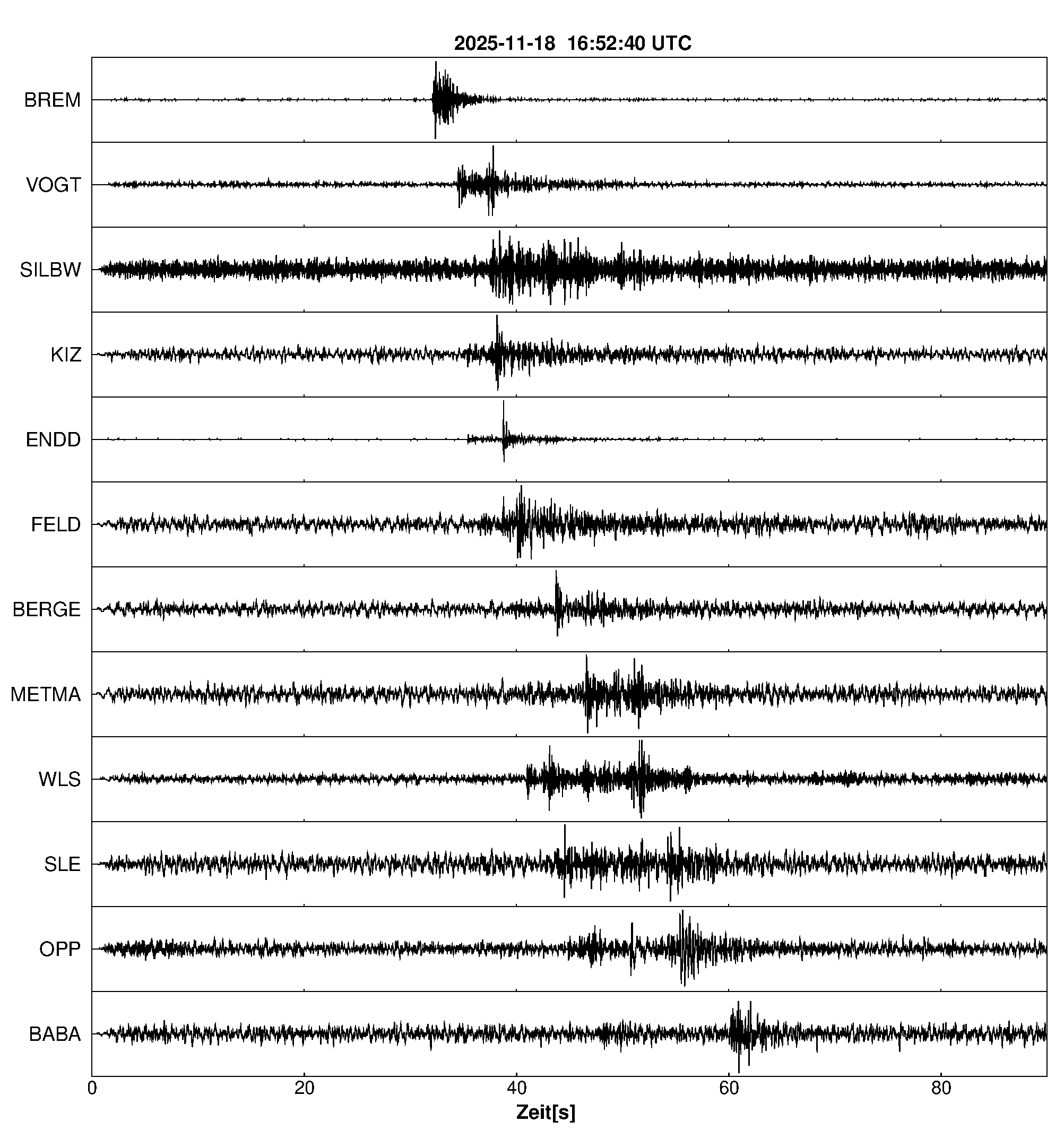 Pfadnavigation Startseite Geologischer Dienst Erdbeben Aktuelle Erdbeben Erdbeben bei Hartheim am Rhein, Lkrs. Breisgau-H., BW Teilen Erdbeben bei Hartheim am Rhein, Lkrs. Breisgau-H., BW Erdbeben bei: Hartheim am Rhein, Lkrs. Breisgau-H., BW Datum/Uhrzeit: am 18.11.2025 um 17:53 Uhr Ortszeit (MEZ) Stärke: 0.9 (Magnitude auf der Richter-Skala) Epizentrum: 47.93° N ㅤ 7.62° E Herdtiefe: ca. 4 km unter der Erdoberfläche Bemerkung: sehr schwaches Erdbeben Seismogramme ausgewählter Erdbebenmessstationen: Erläuterungen: Datum/Uhrzeit:Datum und Zeit des Erdbebens in Ortszeit, also MEZ oder MESZ; Epizentrum:Punkt an der Erdoberfläche über dem Hypozentrum (Lage des Erdbebenherdes in der Tiefe); Magnitude:Erdbebenstärke auf der Richterskala (Lokalmagnitude ML); Herdtiefe:Tiefe des Erdbebens (Hypozentrums) in Kilometern unter NN. Seismogramme:Details zu den Erdbebenmessstationen finden sich im Kartenviewer des LGRB (Baden-Württemberg) und im Kartenviewer des LGB (Rheinland-Pfalz).