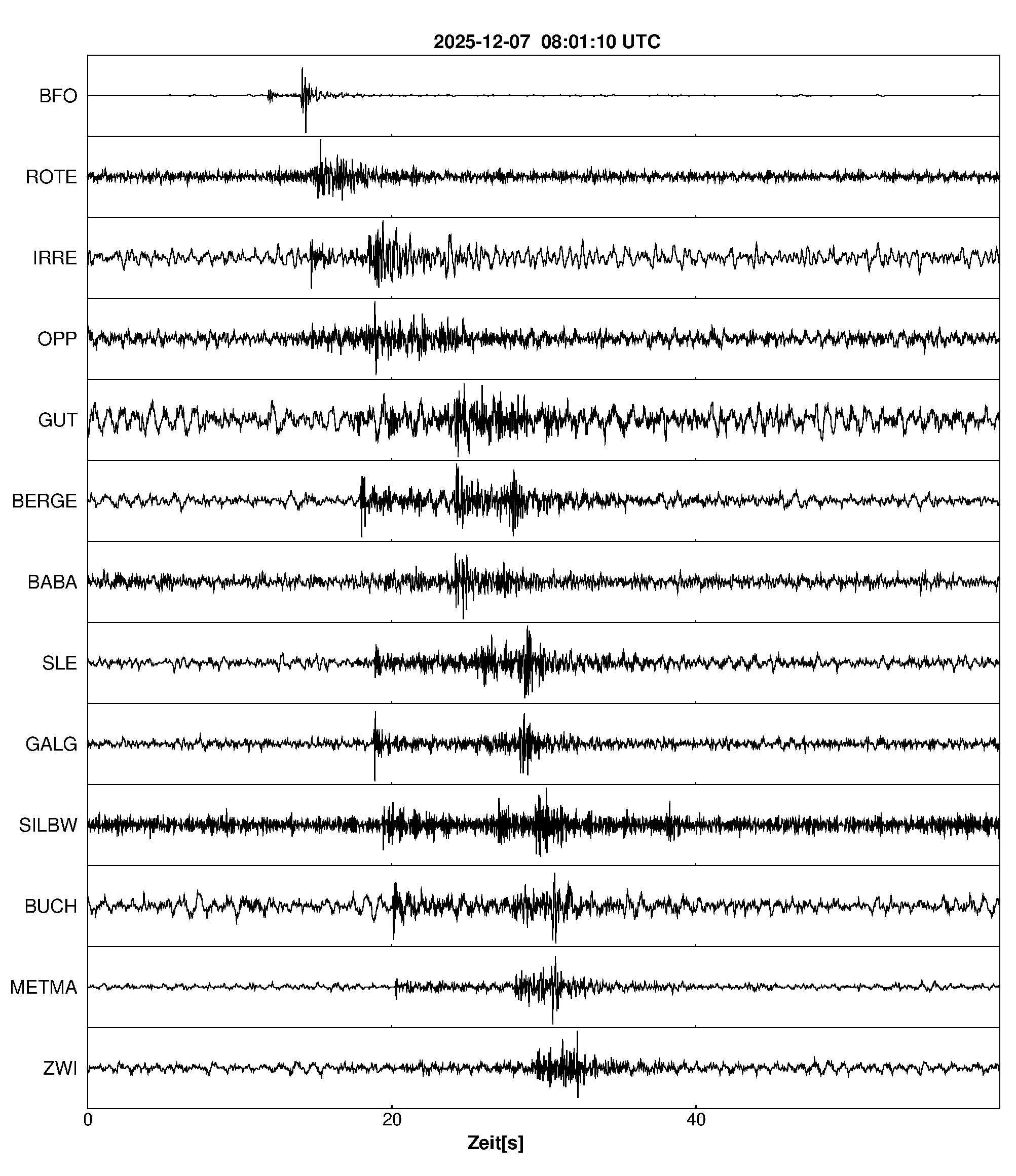 Pfadnavigation Startseite Geologischer Dienst Erdbeben Aktuelle Erdbeben Erdbeben bei Fluorn-Winzeln, Lkrs. Rottweil, BW Teilen Erdbeben bei Fluorn-Winzeln, Lkrs. Rottweil, BW Erdbeben bei: Fluorn-Winzeln, Lkrs. Rottweil, BW Datum/Uhrzeit: am 07.12.2025 um 09:01 Uhr Ortszeit (MEZ) Stärke: 0.9 (Magnitude auf der Richter-Skala) Epizentrum: 48.29° N ㅤ 8.51° E Herdtiefe: ca. 10 km unter der Erdoberfläche Bemerkung: sehr schwaches Erdbeben Seismogramme ausgewählter Erdbebenmessstationen: Erläuterungen: Datum/Uhrzeit:Datum und Zeit des Erdbebens in Ortszeit, also MEZ oder MESZ; Epizentrum:Punkt an der Erdoberfläche über dem Hypozentrum (Lage des Erdbebenherdes in der Tiefe); Magnitude:Erdbebenstärke auf der Richterskala (Lokalmagnitude ML); Herdtiefe:Tiefe des Erdbebens (Hypozentrums) in Kilometern unter NN. Seismogramme:Details zu den Erdbebenmessstationen finden sich im Kartenviewer des LGRB (Baden-Württemberg) und im Kartenviewer des LGB (Rheinland-Pfalz).