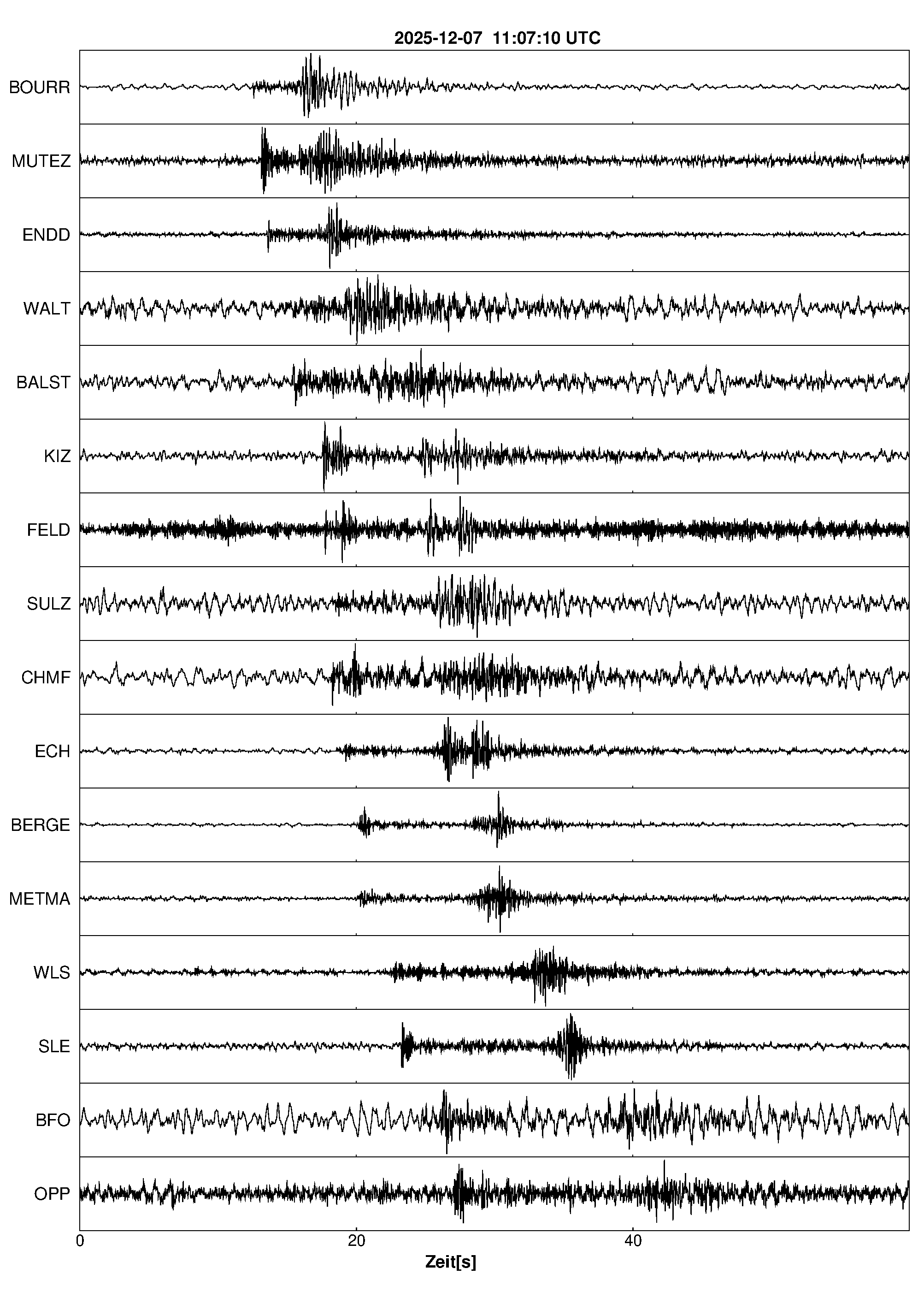 Pfadnavigation Startseite Geologischer Dienst Erdbeben Aktuelle Erdbeben Erdbeben bei Walheim, Dep. Haut-Rhin, F Teilen Erdbeben bei Walheim, Dep. Haut-Rhin, F Erdbeben außerhalb von Baden-Württemberg und Rheinland-Pfalz:Die maßgeblichen Angaben veröffentlicht der lokal zuständige Erdbebendienst. Erdbeben bei: Walheim, Dep. Haut-Rhin, F Datum/Uhrzeit: am 07.12.2025 um 12:07 Uhr Ortszeit (MEZ) Stärke: 1.3 (Magnitude auf der Richter-Skala) Epizentrum: 47.64° N ㅤ 7.28° E Herdtiefe: ca. 12 km unter der Erdoberfläche Bemerkung: sehr schwaches Erdbeben Seismogramme ausgewählter Erdbebenmessstationen: Erläuterungen: Datum/Uhrzeit:Datum und Zeit des Erdbebens in Ortszeit, also MEZ oder MESZ; Epizentrum:Punkt an der Erdoberfläche über dem Hypozentrum (Lage des Erdbebenherdes in der Tiefe); Magnitude:Erdbebenstärke auf der Richterskala (Lokalmagnitude ML); Herdtiefe:Tiefe des Erdbebens (Hypozentrums) in Kilometern unter NN. Seismogramme:Details zu den Erdbebenmessstationen finden sich im Kartenviewer des LGRB (Baden-Württemberg) und im Kartenviewer des LGB (Rheinland-Pfalz).
