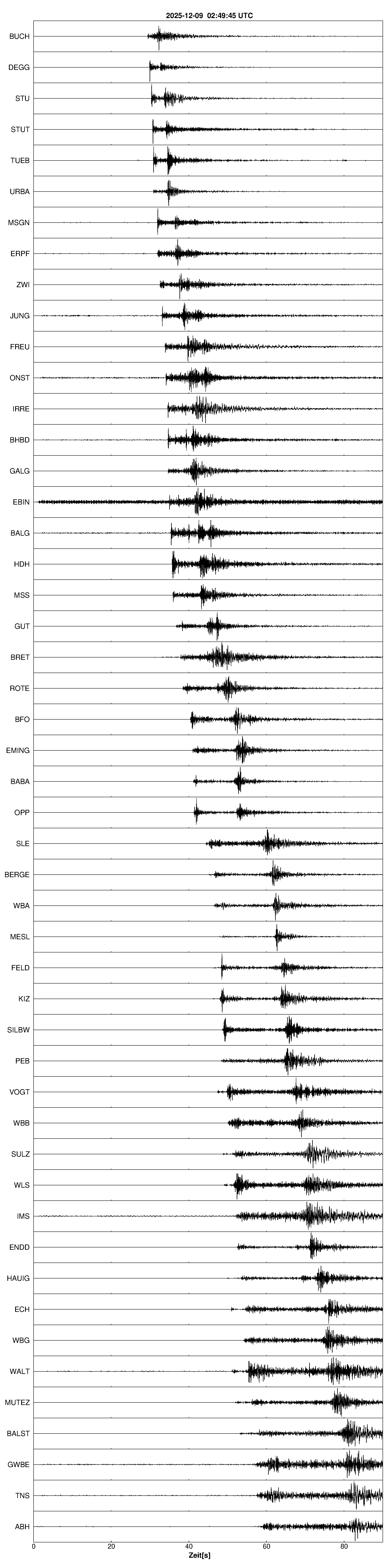 Pfadnavigation Startseite Geologischer Dienst Erdbeben Aktuelle Erdbeben Erdbeben bei Dettingen unter Teck, Lkrs. Esslingen, BW Teilen Erdbeben bei Dettingen unter Teck, Lkrs. Esslingen, BW Erdbeben bei: Dettingen unter Teck, Lkrs. Esslingen, BW Datum/Uhrzeit: am 09.12.2025 um 03:50 Uhr Ortszeit (MEZ) Stärke: 3.0 (Magnitude auf der Richter-Skala) Epizentrum: 48.6° N ㅤ 9.42° E Herdtiefe: ca. 10 km unter der Erdoberfläche Wahrnehmungen: im Umkreis von ca. 10 km wahrgenommen, vereinzelt darüber hinaus Bemerkung: schwaches Erdbeben Haben Sie dieses Erdbeben gespürt? Seismogramme ausgewählter Erdbebenmessstationen: Erläuterungen: Datum/Uhrzeit:Datum und Zeit des Erdbebens in Ortszeit, also MEZ oder MESZ; Epizentrum:Punkt an der Erdoberfläche über dem Hypozentrum (Lage des Erdbebenherdes in der Tiefe); Magnitude:Erdbebenstärke auf der Richterskala (Lokalmagnitude ML); Herdtiefe:Tiefe des Erdbebens (Hypozentrums) in Kilometern unter NN. Seismogramme:Details zu den Erdbebenmessstationen finden sich im Kartenviewer des LGRB (Baden-Württemberg) und im Kartenviewer des LGB (Rheinland-Pfalz).