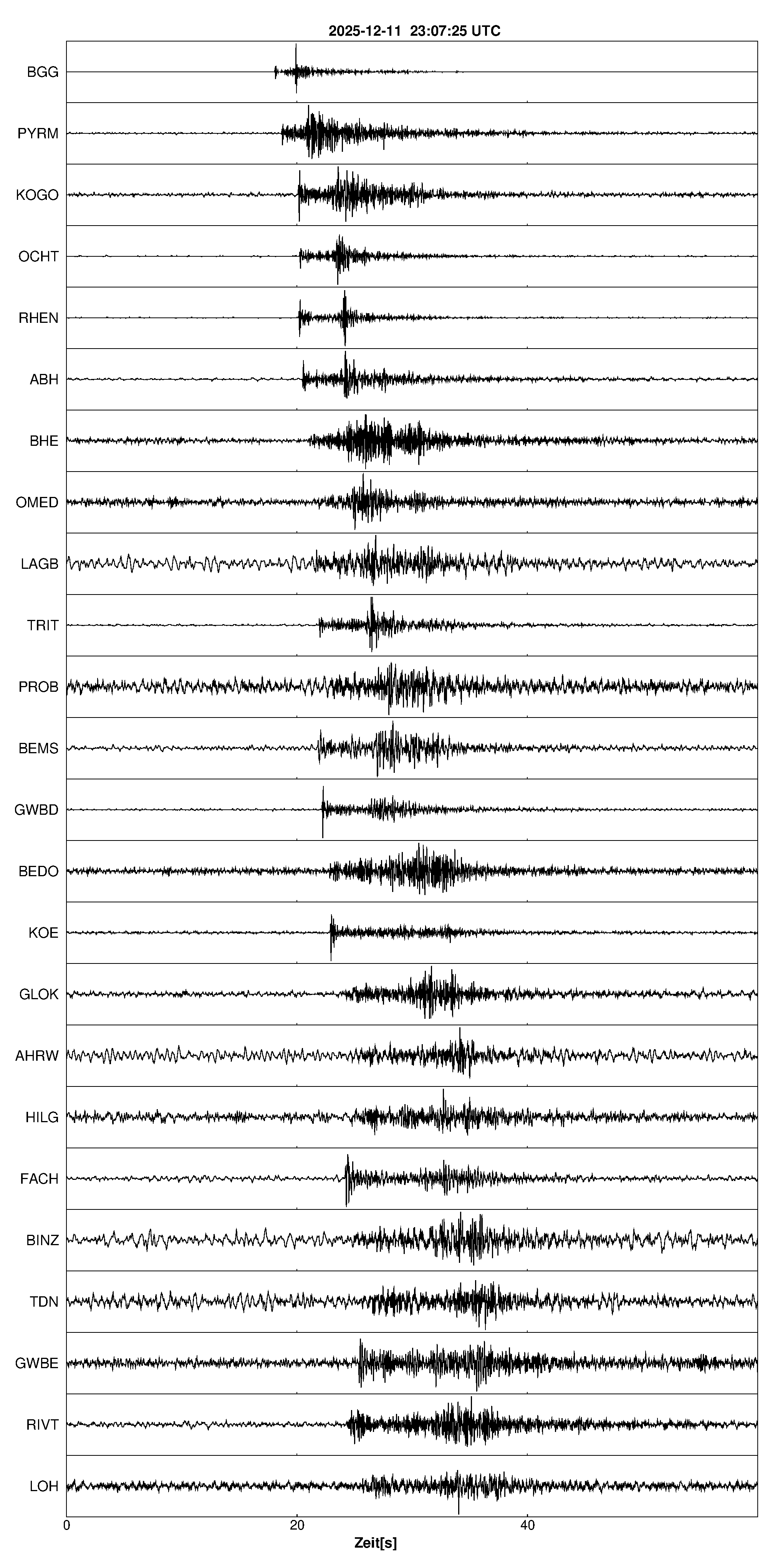 Pfadnavigation Startseite Geologischer Dienst Erdbeben Aktuelle Erdbeben Erdbeben bei Mörsdorf, Rhein-Hunsrück-Kreis, RP Teilen Erdbeben bei Mörsdorf, Rhein-Hunsrück-Kreis, RP Erdbeben bei: Mörsdorf, Rhein-Hunsrück-Kreis, RP Datum/Uhrzeit: am 12.12.2025 um 00:07 Uhr Ortszeit (MEZ) Stärke: 1.0 (Magnitude auf der Richter-Skala) Epizentrum: 50.1° N ㅤ 7.36° E Herdtiefe: ca. 9 km unter der Erdoberfläche Bemerkung: sehr schwaches Erdbeben Seismogramme ausgewählter Erdbebenmessstationen: Erläuterungen: Datum/Uhrzeit:Datum und Zeit des Erdbebens in Ortszeit, also MEZ oder MESZ; Epizentrum:Punkt an der Erdoberfläche über dem Hypozentrum (Lage des Erdbebenherdes in der Tiefe); Magnitude:Erdbebenstärke auf der Richterskala (Lokalmagnitude ML); Herdtiefe:Tiefe des Erdbebens (Hypozentrums) in Kilometern unter NN. Seismogramme:Details zu den Erdbebenmessstationen finden sich im Kartenviewer des LGRB (Baden-Württemberg) und im Kartenviewer des LGB (Rheinland-Pfalz).
